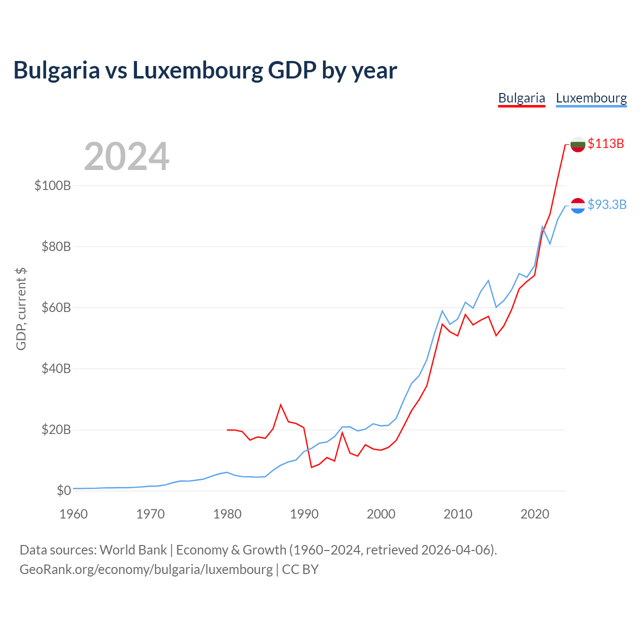 Bulgaria has a GDP of $113B compared to $93.3B for Luxembourg, ranking 67/197 and 74/197 by economy size, respectively.