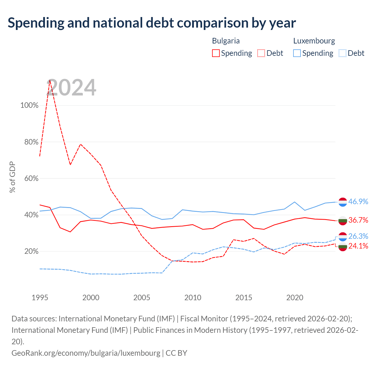 Bulgaria has $27.3B in government debt (24.1% of GDP), compared to $24.5B (26.3% of GDP) in Luxembourg.