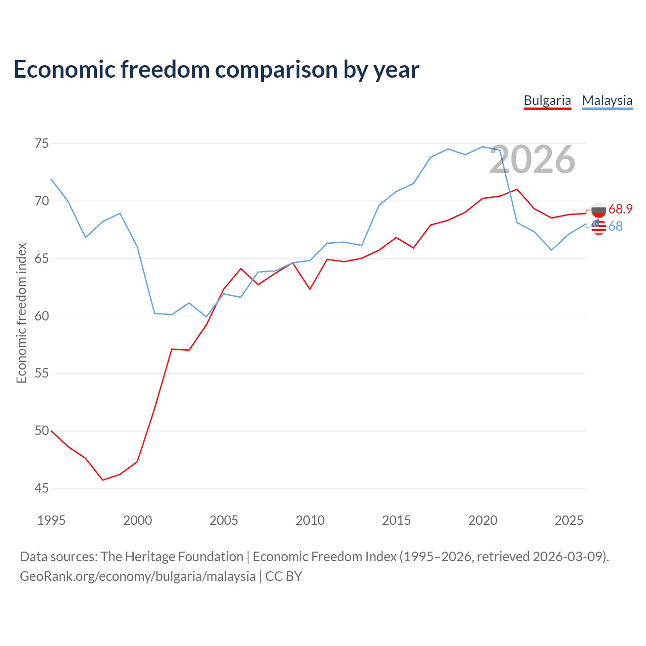 The Economic Freedom Index for Bulgaria is 68.9, ranking 44/197, compared to 68 for Malaysia, ranking 51/197. The chart above displays a comparison of annual changes in economic freedom indexes.