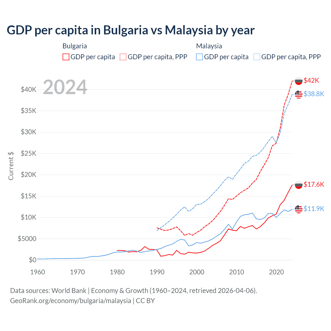 GDP per capita in Bulgaria vs Malaysia by year