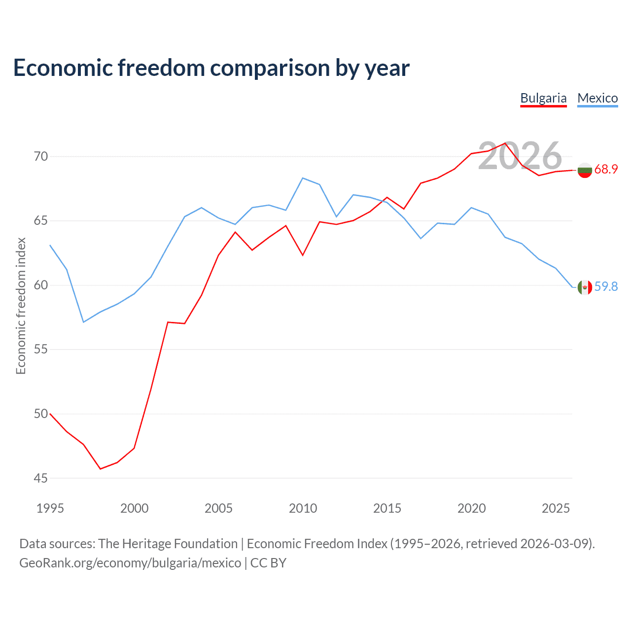 The Economic Freedom Index for Bulgaria is 68.9, ranking 44/197, compared to 59.8 for Mexico, ranking 102/197. The chart above displays a comparison of annual changes in economic freedom indexes.