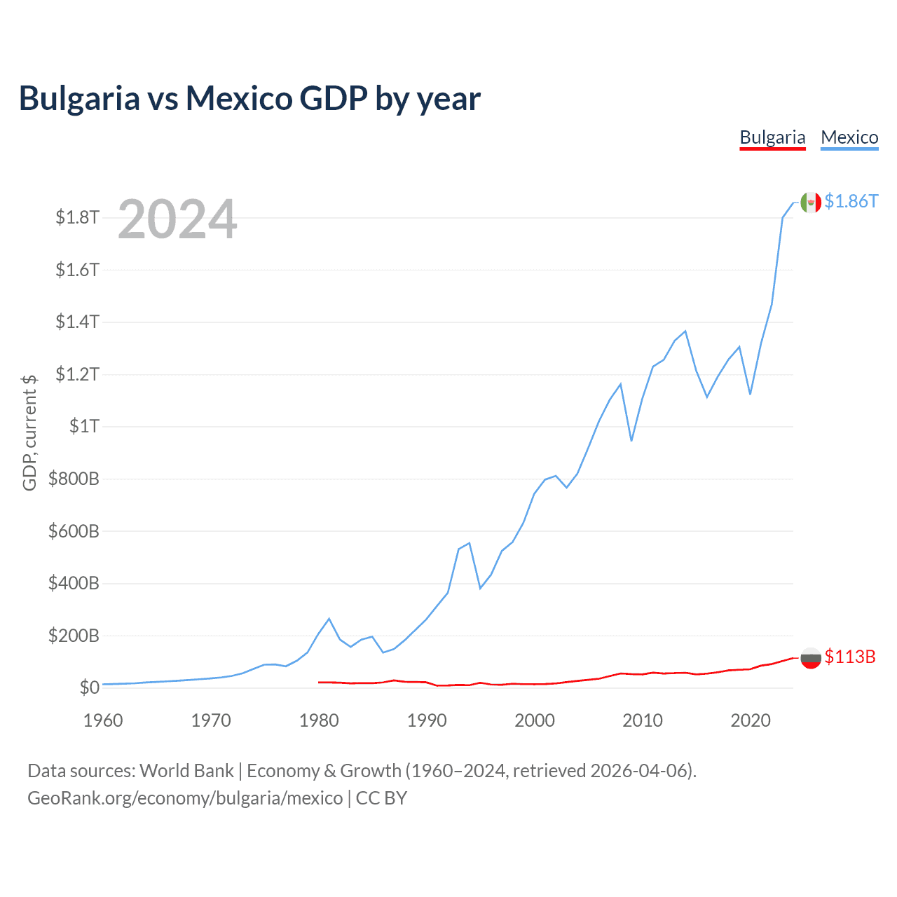 Bulgaria has a GDP of $113B compared to $1.86T for Mexico, ranking 67/197 and 13/197 by economy size, respectively.