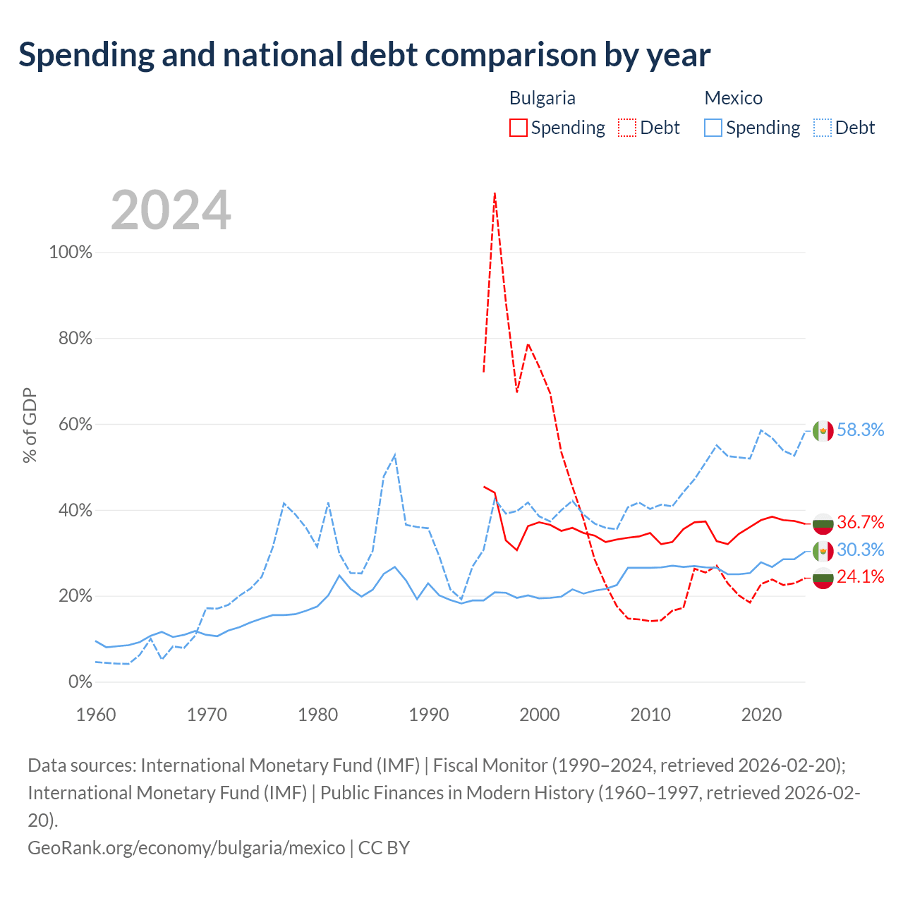 Bulgaria has $27.3B in government debt (24.1% of GDP), compared to $1.08T (58.3% of GDP) in Mexico.