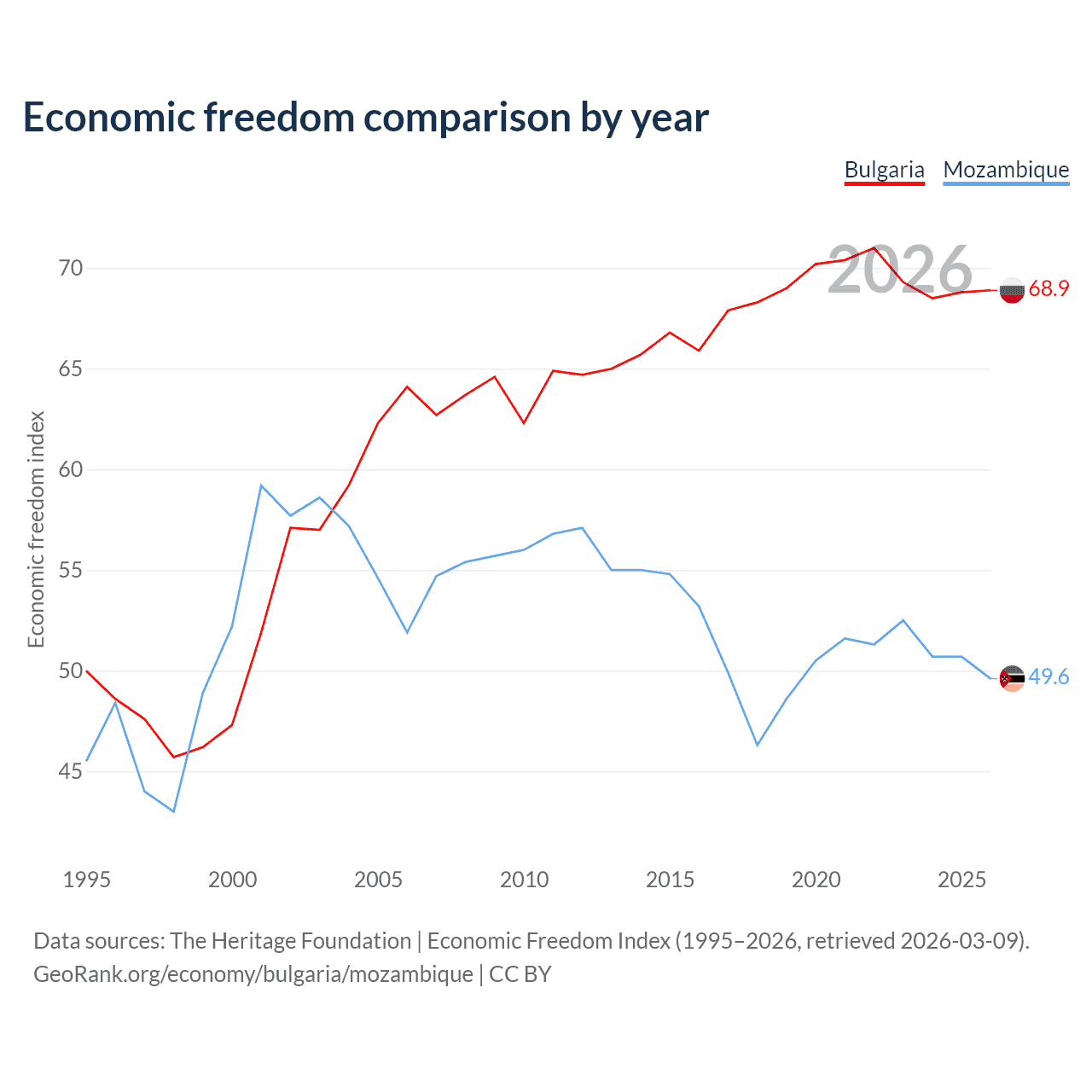 The Economic Freedom Index for Bulgaria is 68.9, ranking 44/197, compared to 49.6 for Mozambique, ranking 164/197. The chart above displays a comparison of annual changes in economic freedom indexes.