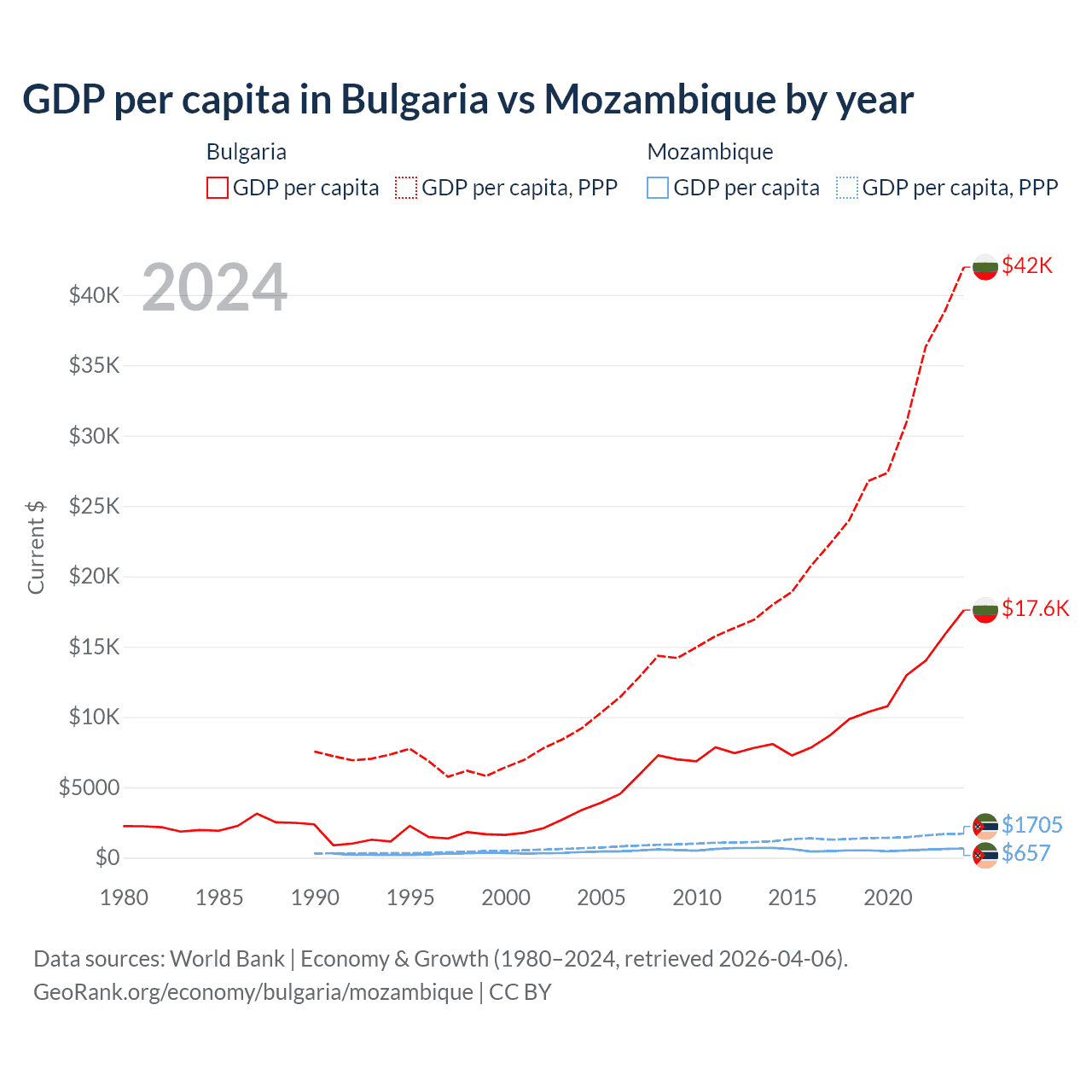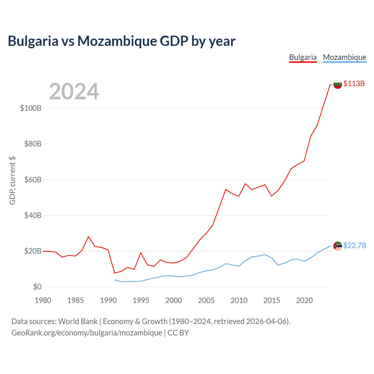 Bulgaria has a GDP of $113B compared to $22.7B for Mozambique, ranking 67/197 and 123/197 by economy size, respectively.