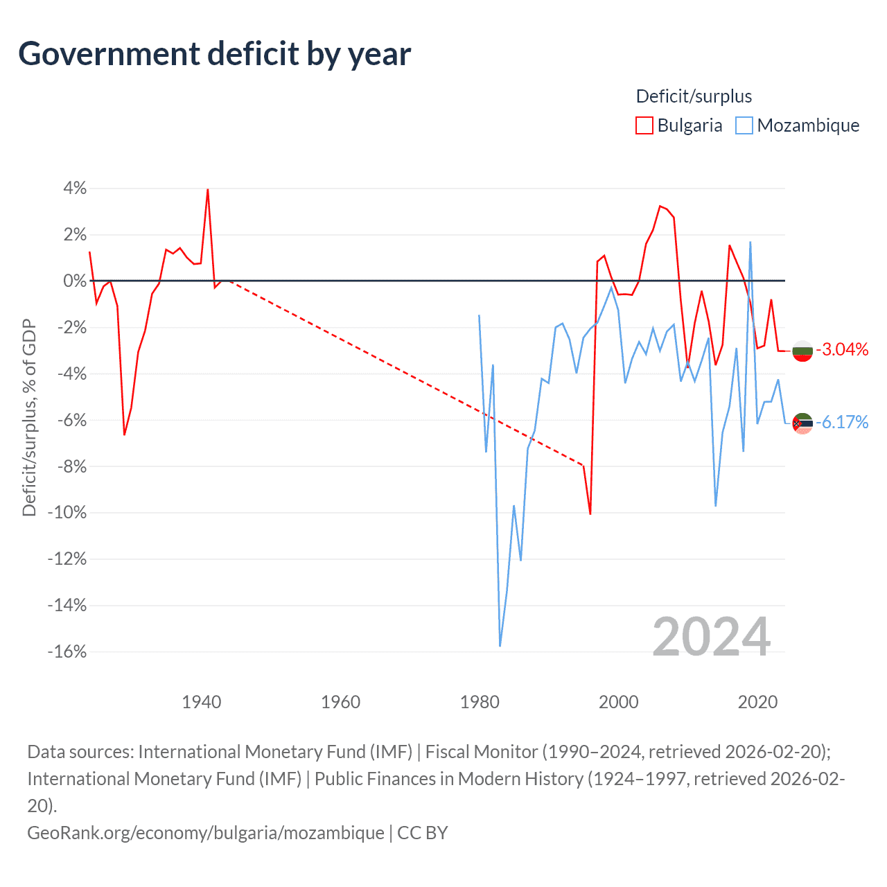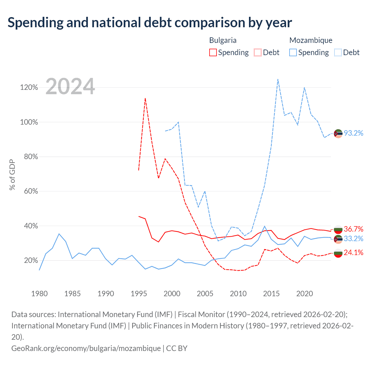 Bulgaria has $27.3B in government debt (24.1% of GDP), compared to $21.2B (93.2% of GDP) in Mozambique.