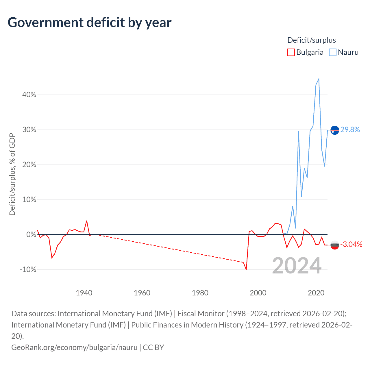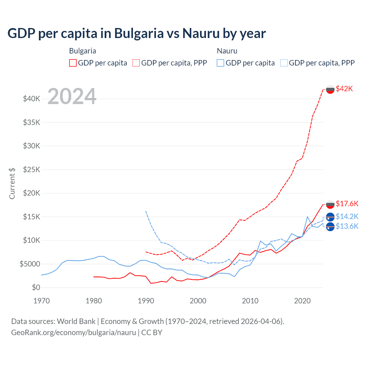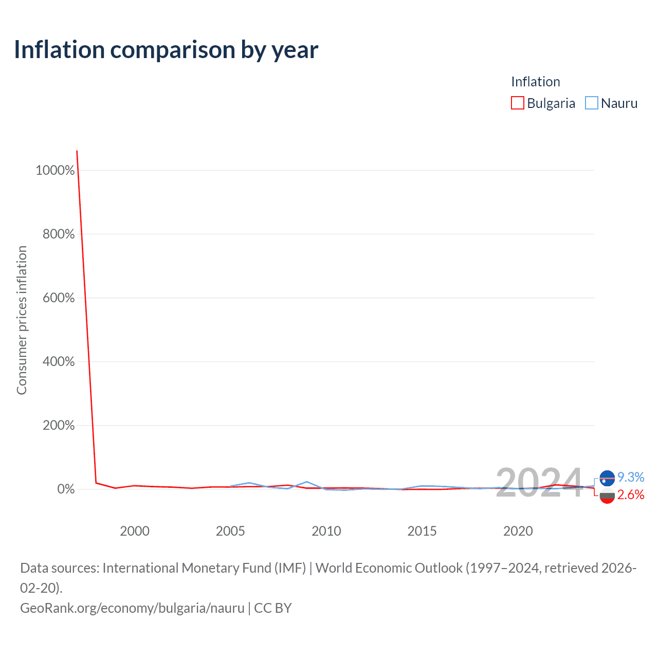 Over the past 20 years, Bulgaria has recorded an average annual inflation rate of 3.76%, compared with 4.84% in Nauru. In 2024, inflation was 2.6% in Bulgaria and 9.3% in Nauru.