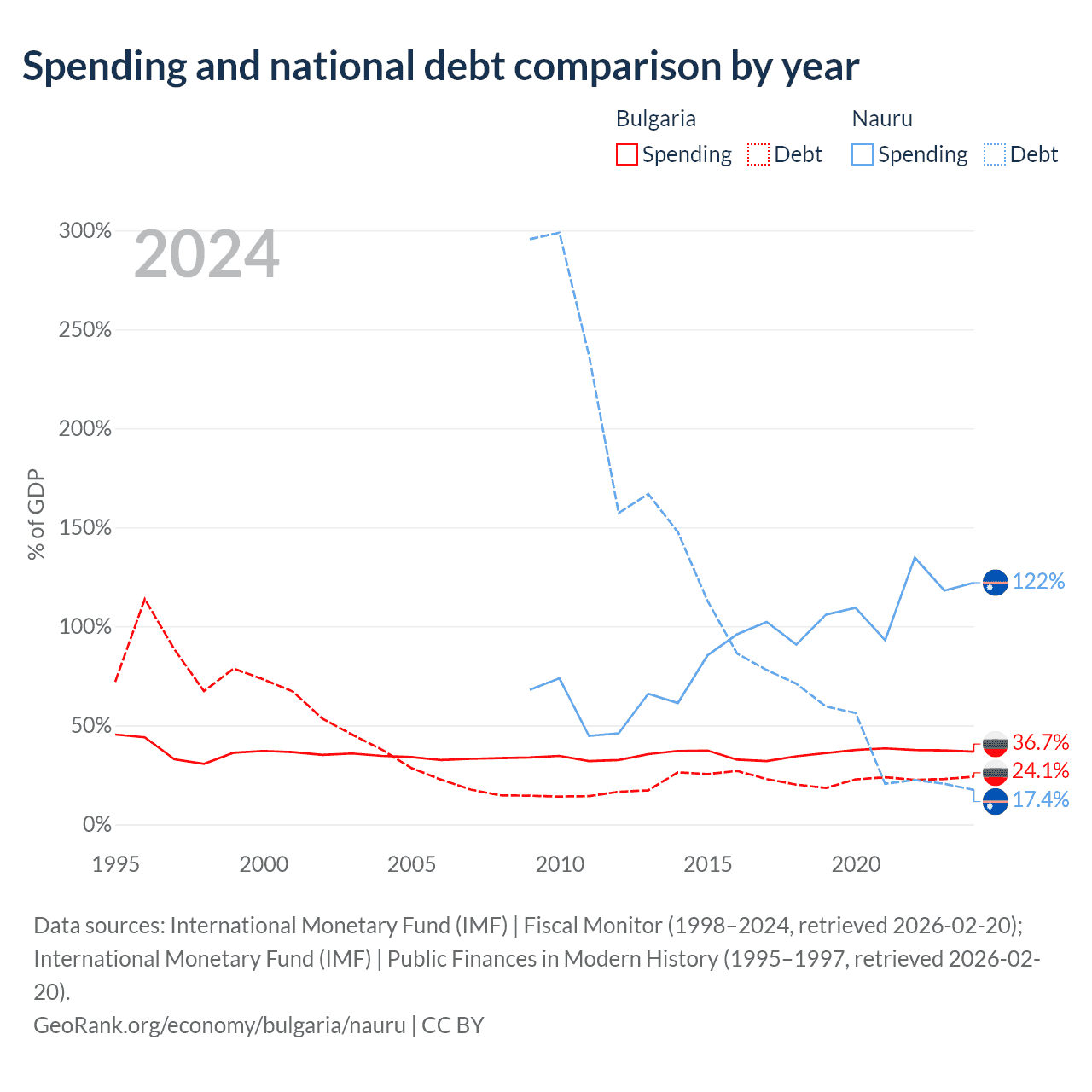 Bulgaria has $27.3B in government debt (24.1% of GDP), compared to $28.3M (17.4% of GDP) in Nauru.