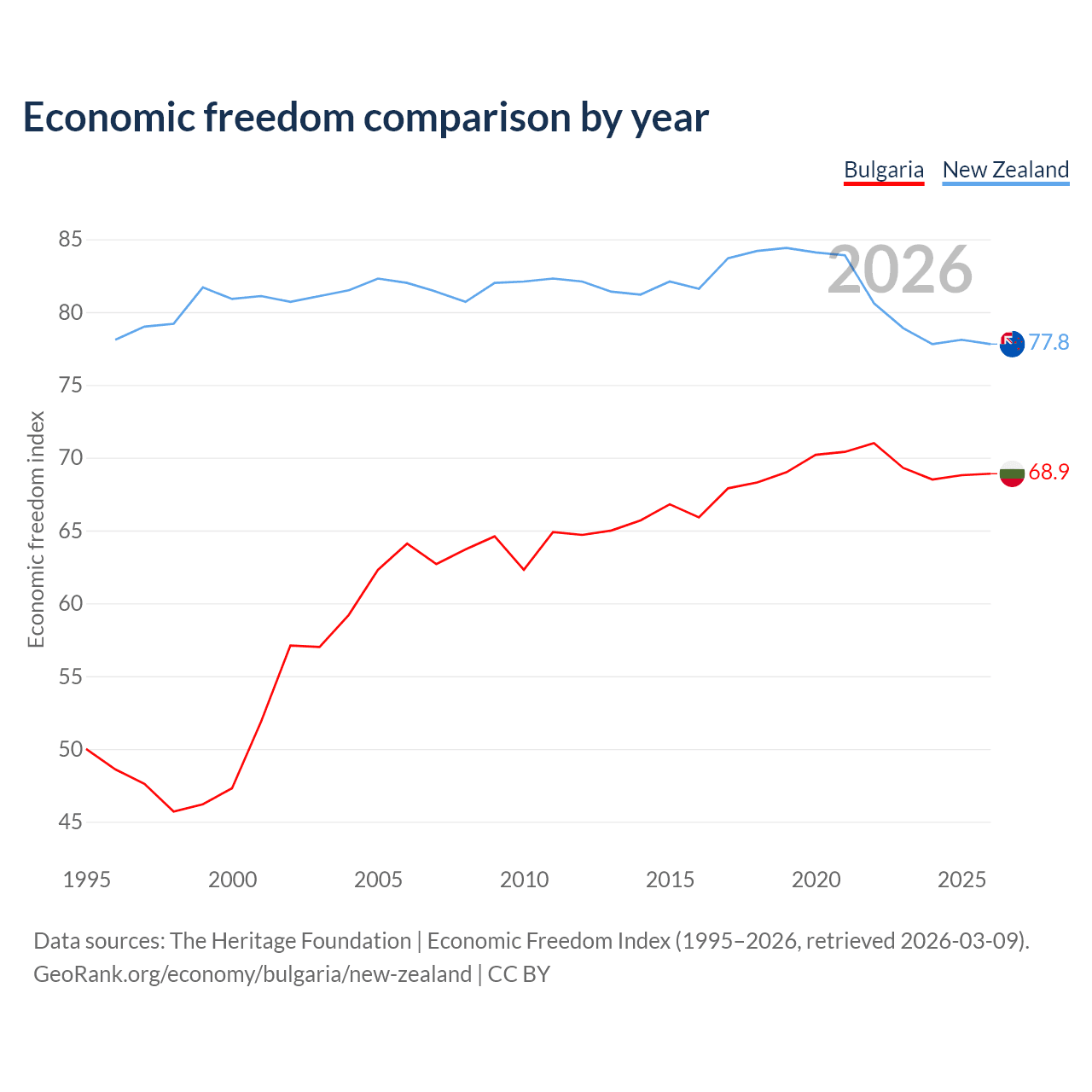 The Economic Freedom Index for Bulgaria is 68.9, ranking 44/197, compared to 77.8 for New Zealand, ranking 13/197. The chart above displays a comparison of annual changes in economic freedom indexes.
