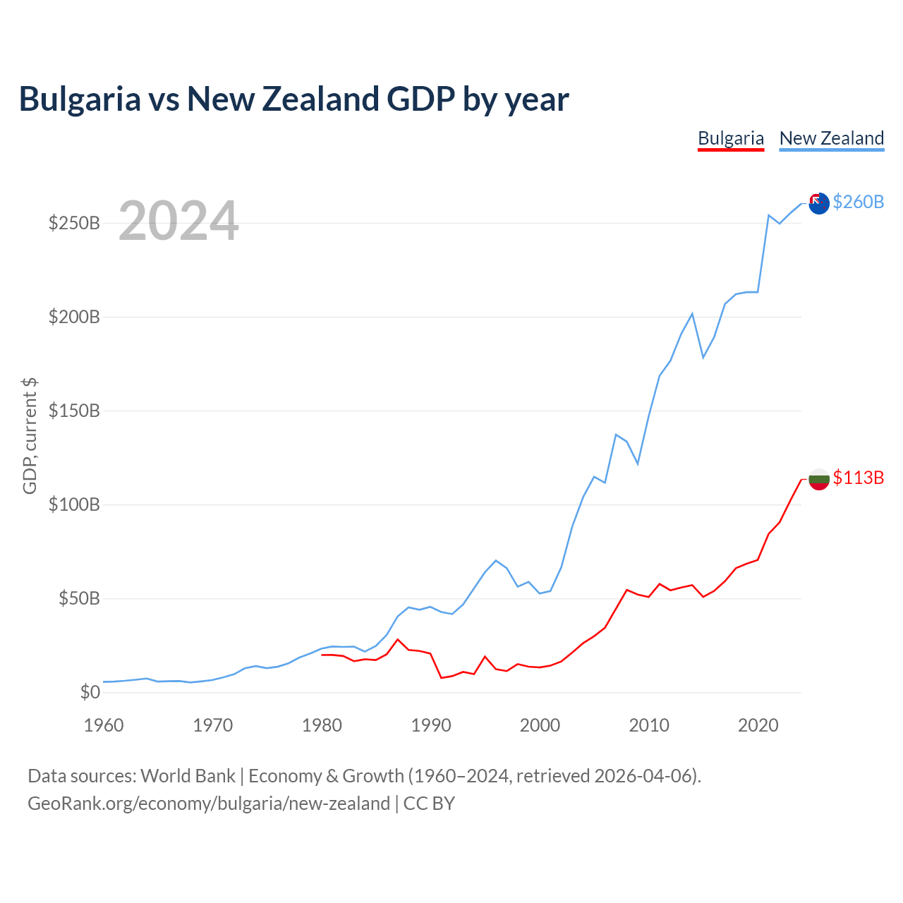 Bulgaria has a GDP of $113B compared to $260B for New Zealand, ranking 67/197 and 52/197 by economy size, respectively.