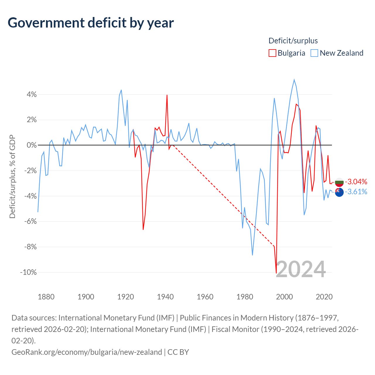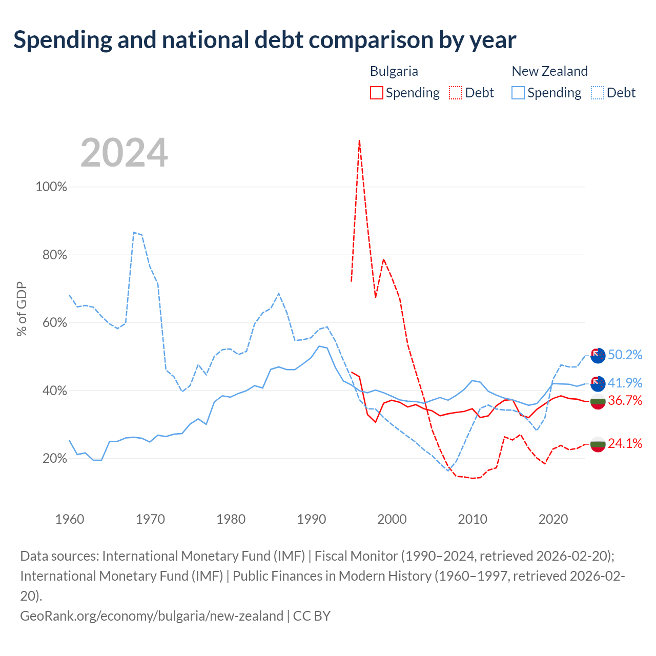 Bulgaria has $27.3B in government debt (24.1% of GDP), compared to $131B (50.2% of GDP) in New Zealand.