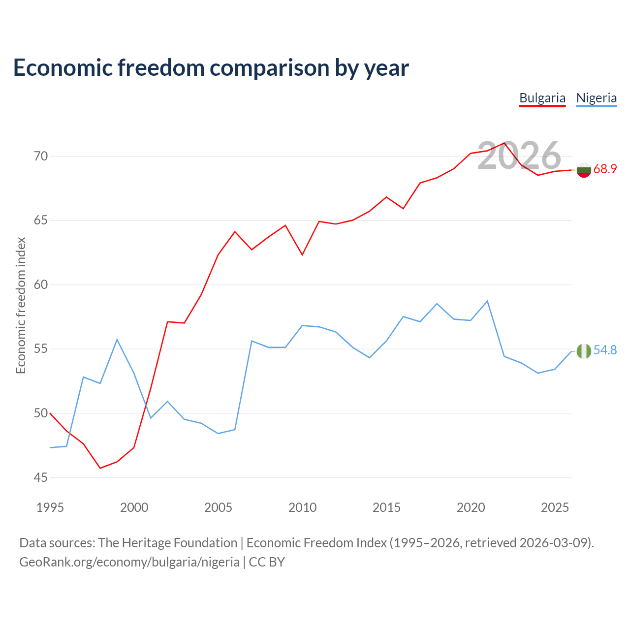 The Economic Freedom Index for Bulgaria is 68.9, ranking 44/197, compared to 54.8 for Nigeria, ranking 132/197. The chart above displays a comparison of annual changes in economic freedom indexes.