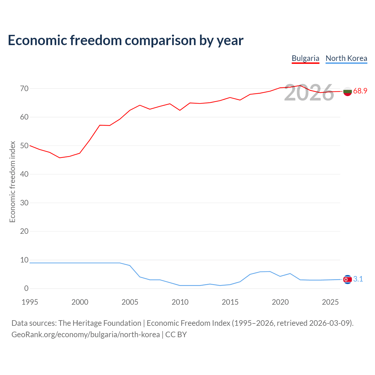 The Economic Freedom Index for Bulgaria is 68.9, ranking 44/197, compared to 3.1 for North Korea, ranking 197/197. The chart above displays a comparison of annual changes in economic freedom indexes.