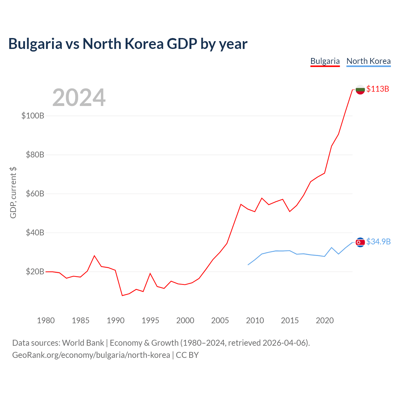 Bulgaria has a GDP of $113B compared to $34.9B for North Korea, ranking 67/197 and 106/197 by economy size, respectively.