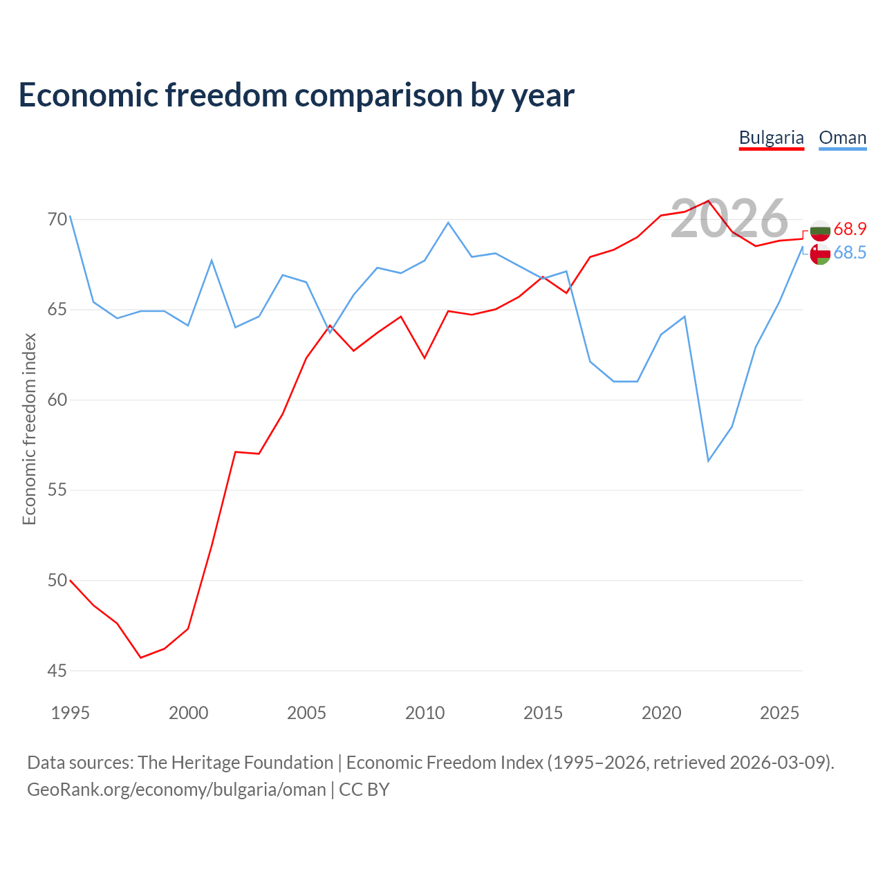 The Economic Freedom Index for Bulgaria is 68.9, ranking 44/197, compared to 68.5 for Oman, ranking 45/197. The chart above displays a comparison of annual changes in economic freedom indexes.