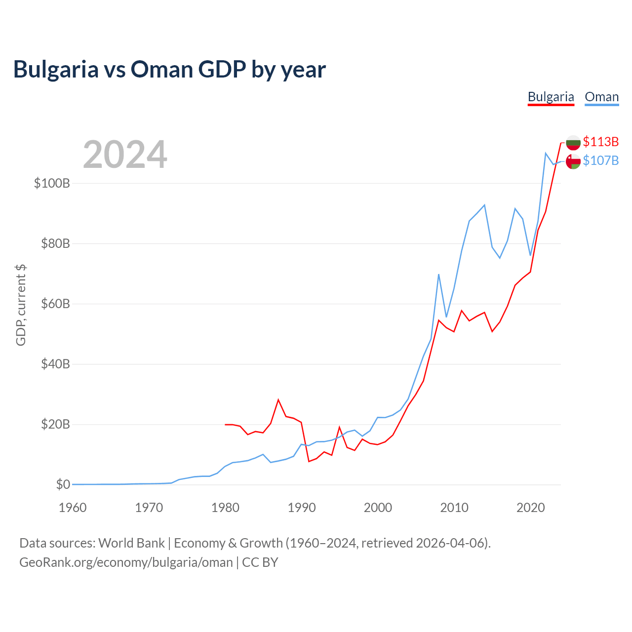Bulgaria has a GDP of $113B compared to $107B for Oman, ranking 67/197 and 70/197 by economy size, respectively.