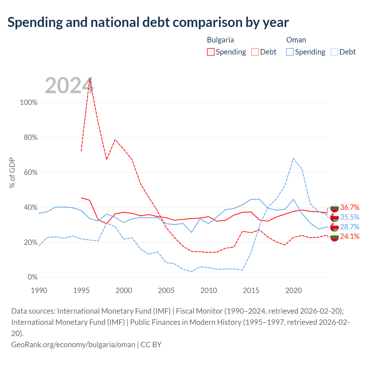 Bulgaria has $27.3B in government debt (24.1% of GDP), compared to $38B (35.5% of GDP) in Oman.