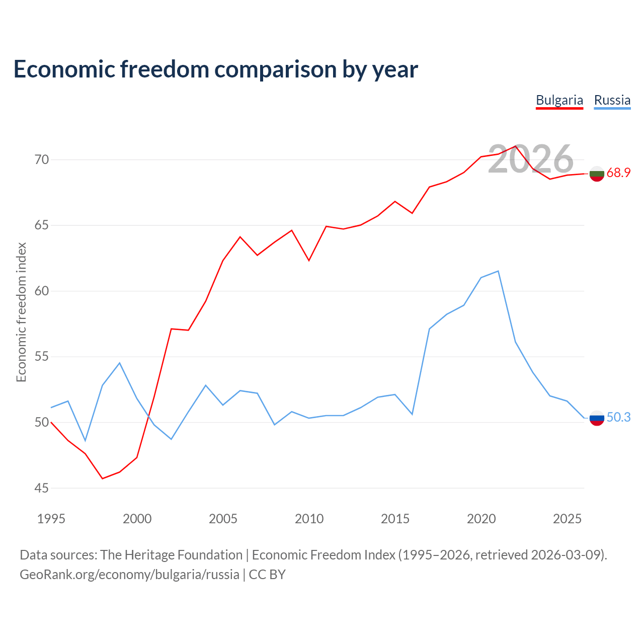 The Economic Freedom Index for Bulgaria is 68.9, ranking 44/197, compared to 50.3 for Russia, ranking 161/197. The chart above displays a comparison of annual changes in economic freedom indexes.