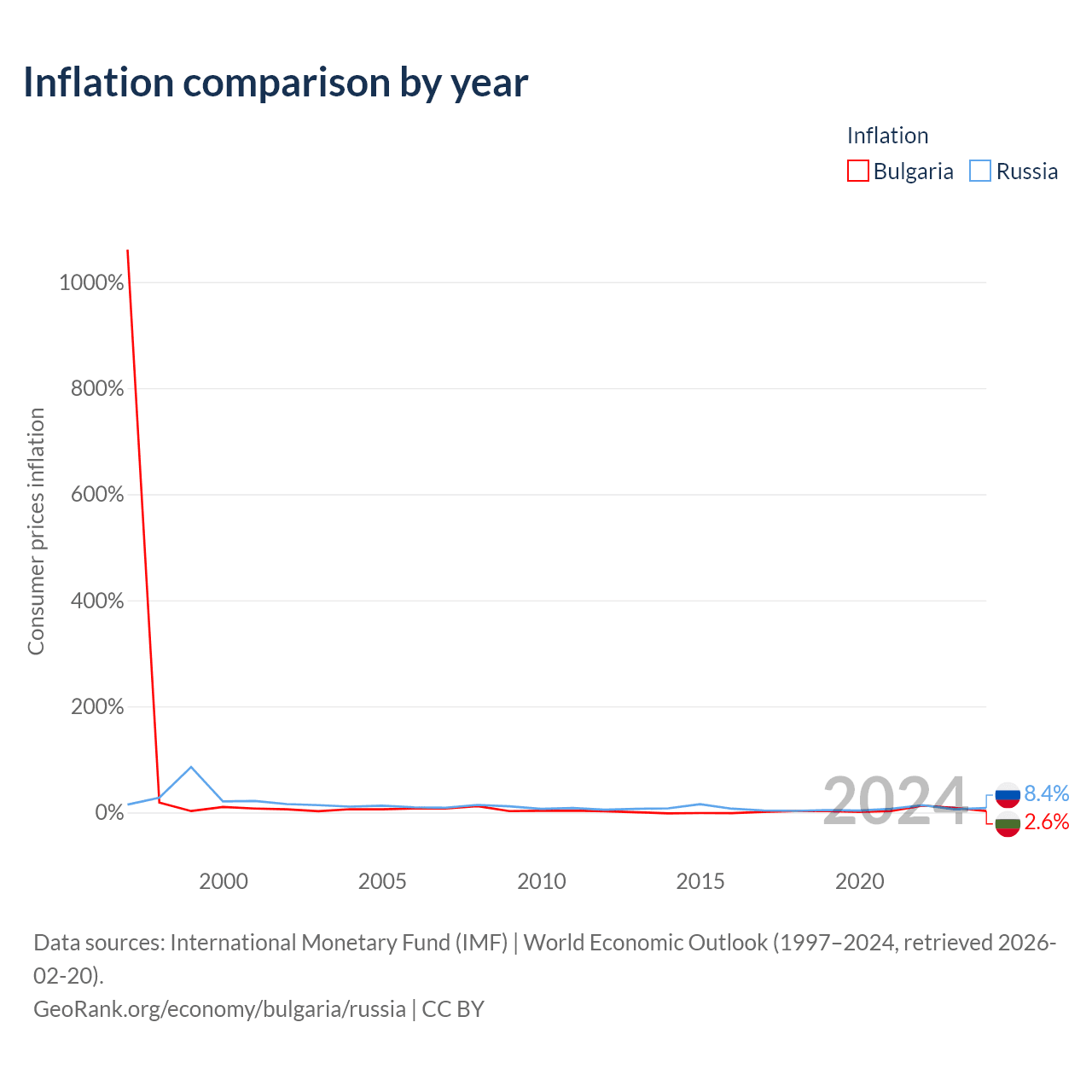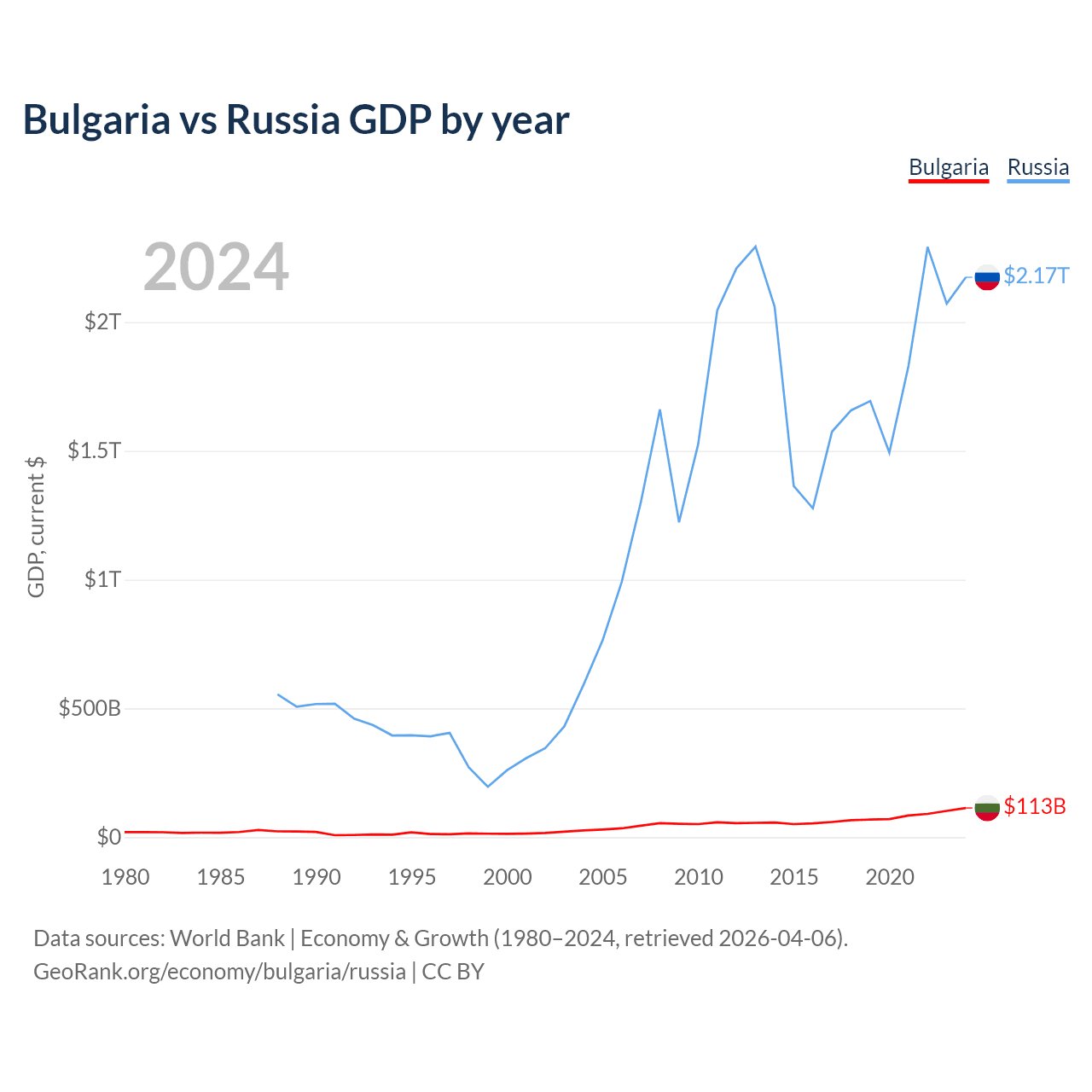 Bulgaria has a GDP of $113B compared to $2.17T for Russia, ranking 67/197 and 11/197 by economy size, respectively.