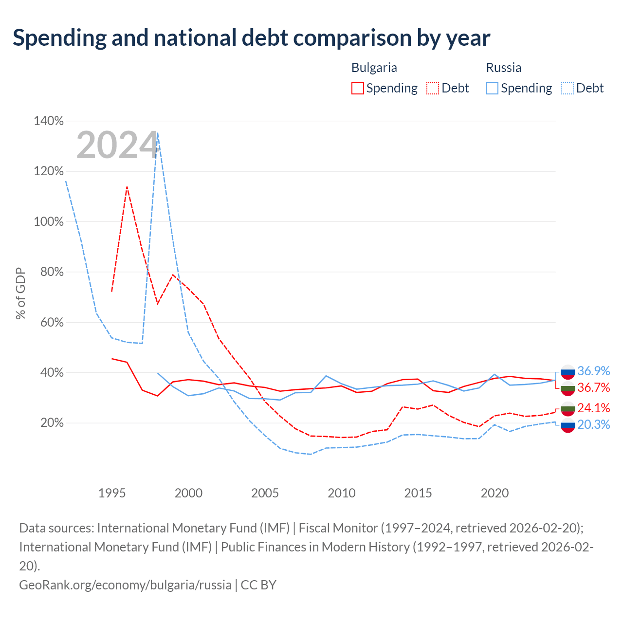 Bulgaria has $27.3B in government debt (24.1% of GDP), compared to $440B (20.3% of GDP) in Russia.
