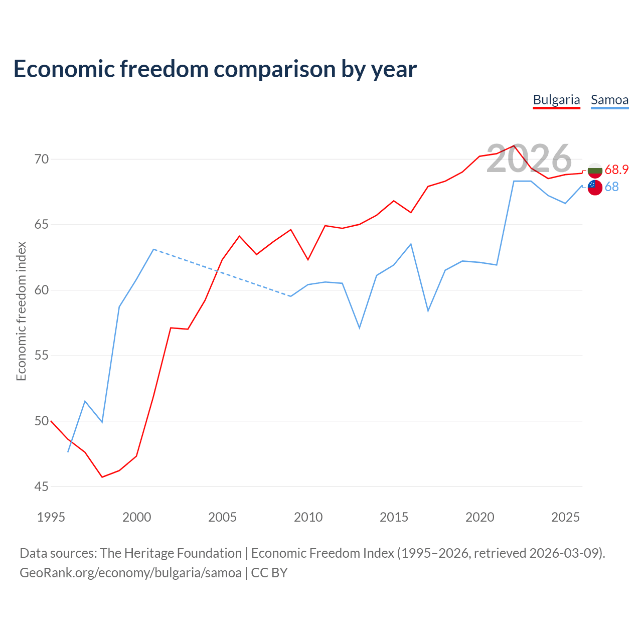 The Economic Freedom Index for Bulgaria is 68.9, ranking 44/197, compared to 68 for Samoa, ranking 52/197. The chart above displays a comparison of annual changes in economic freedom indexes.