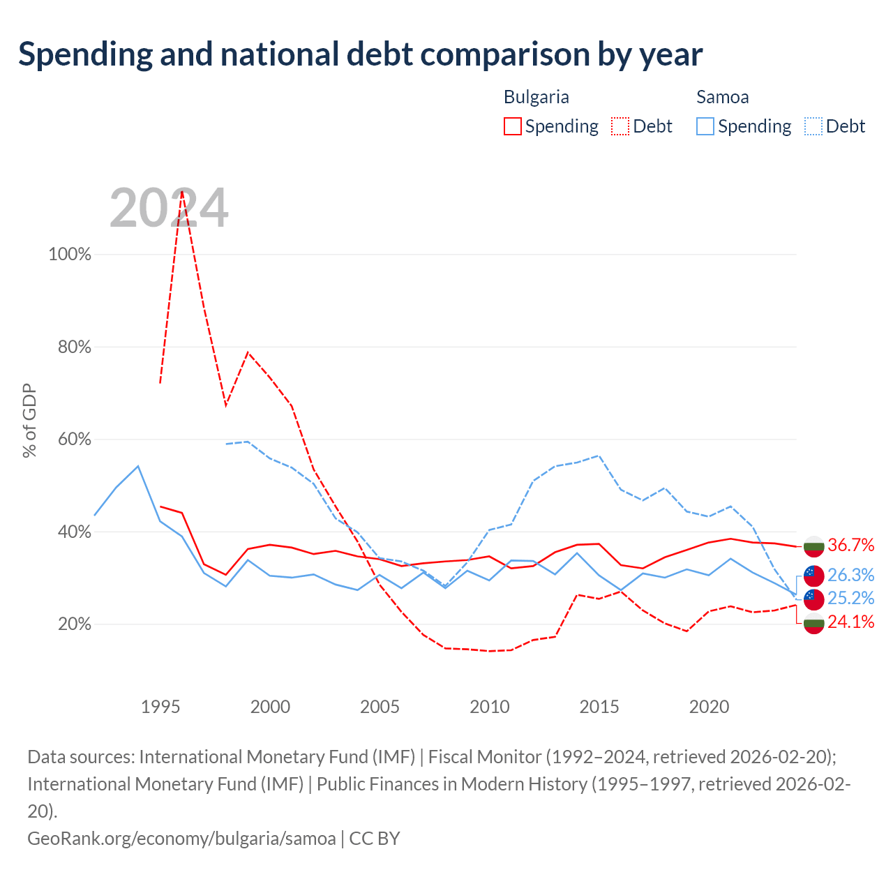 Bulgaria has $27.3B in government debt (24.1% of GDP), compared to $296M (25.2% of GDP) in Samoa.