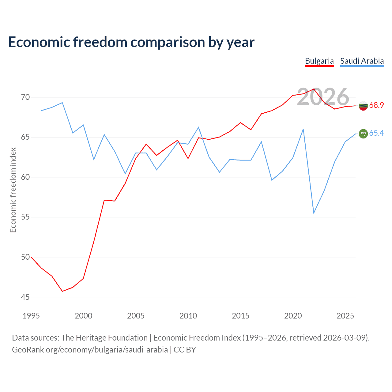 The Economic Freedom Index for Bulgaria is 68.9, ranking 44/197, compared to 65.4 for Saudi Arabia, ranking 65/197. The chart above displays a comparison of annual changes in economic freedom indexes.