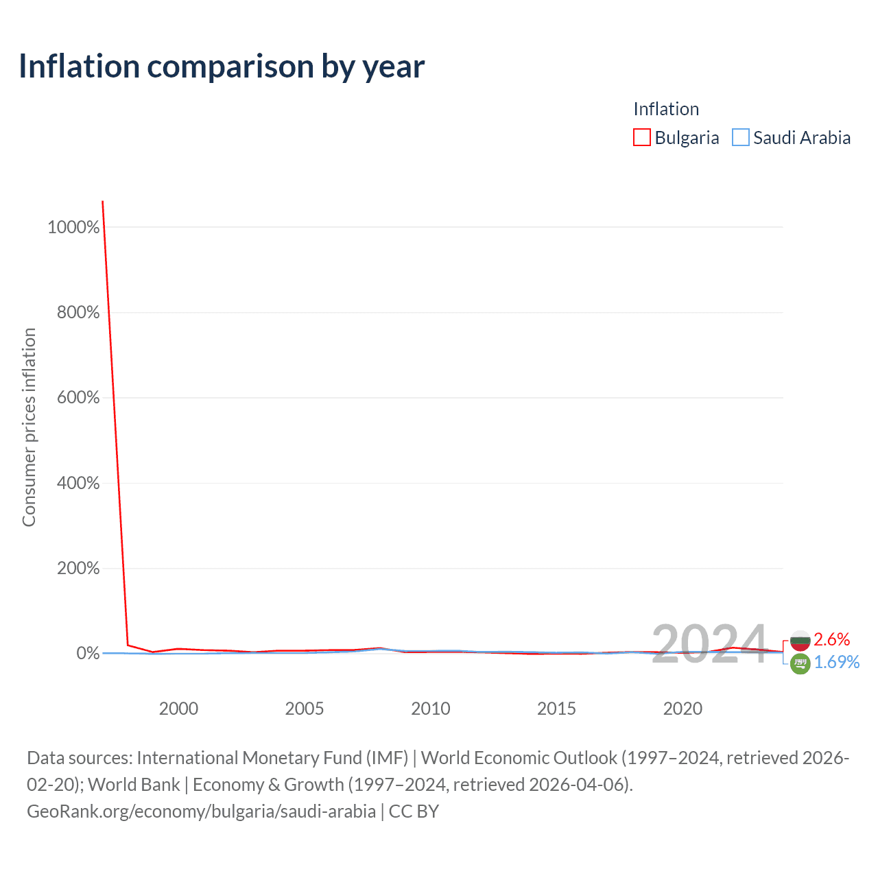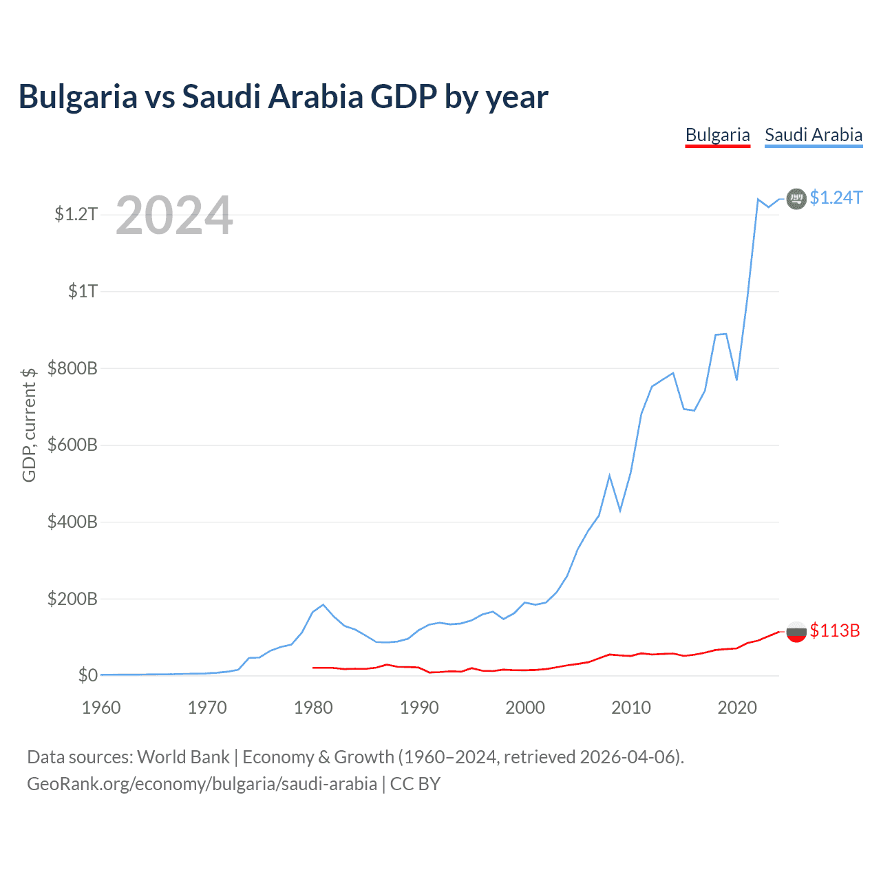 Bulgaria has a GDP of $113B compared to $1.24T for Saudi Arabia, ranking 67/197 and 18/197 by economy size, respectively.