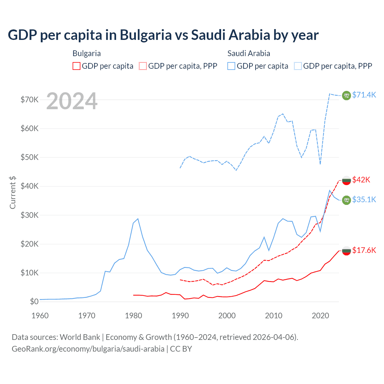 GDP per capita in Bulgaria vs Saudi Arabia by year