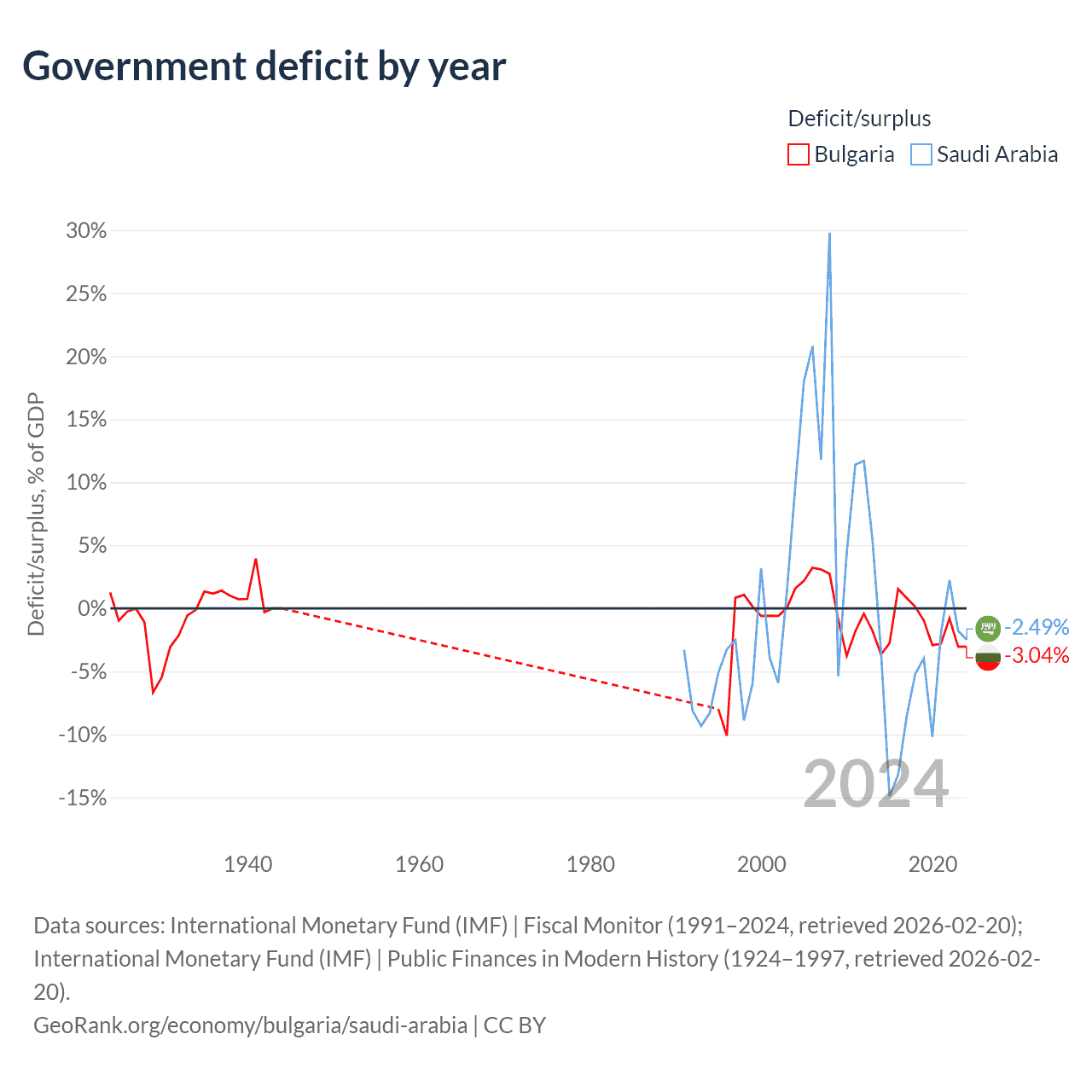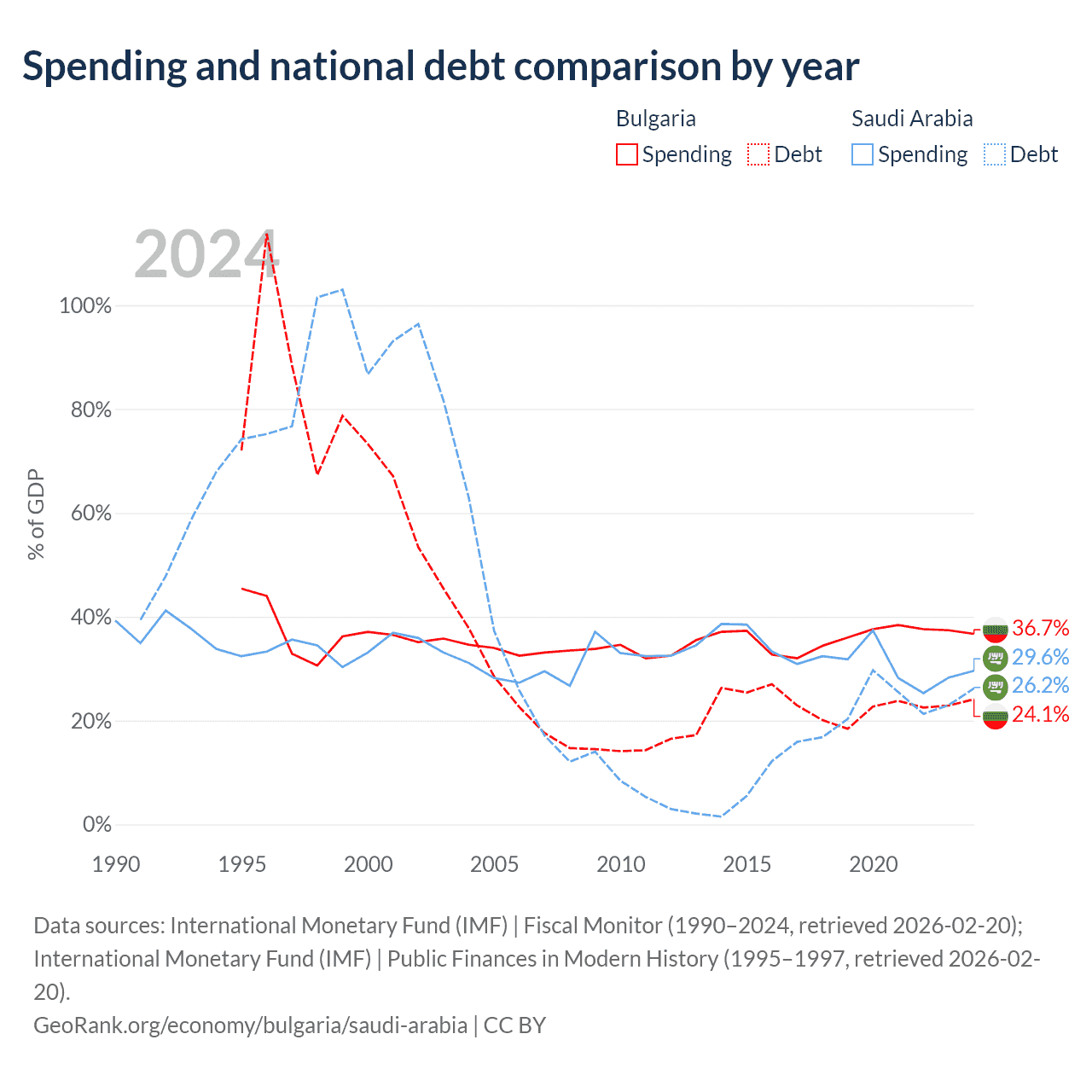 Bulgaria has $27.3B in government debt (24.1% of GDP), compared to $324B (26.2% of GDP) in Saudi Arabia.
