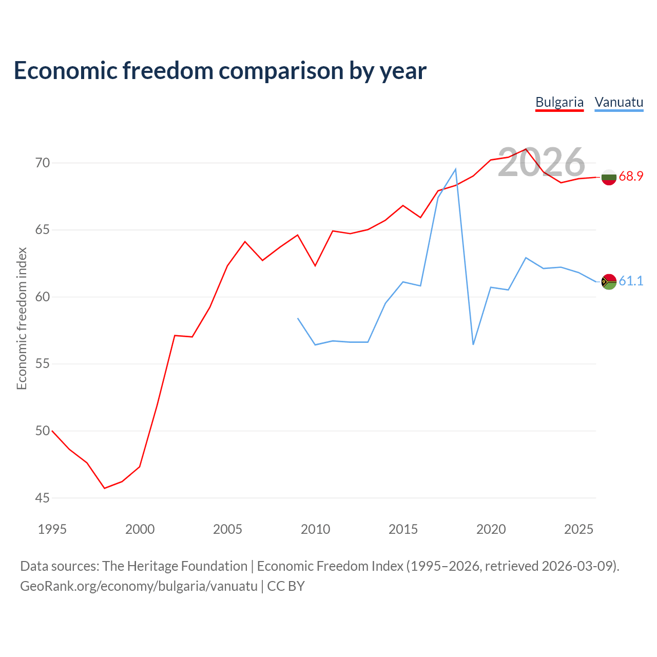 The Economic Freedom Index for Bulgaria is 68.9, ranking 44/197, compared to 61.1 for Vanuatu, ranking 92/197. The chart above displays a comparison of annual changes in economic freedom indexes.