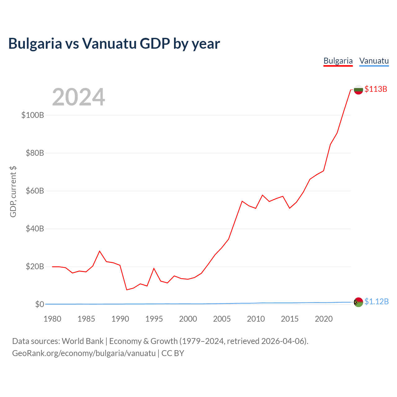 Bulgaria has a GDP of $113B compared to $1.12B for Vanuatu, ranking 67/197 and 188/197 by economy size, respectively.