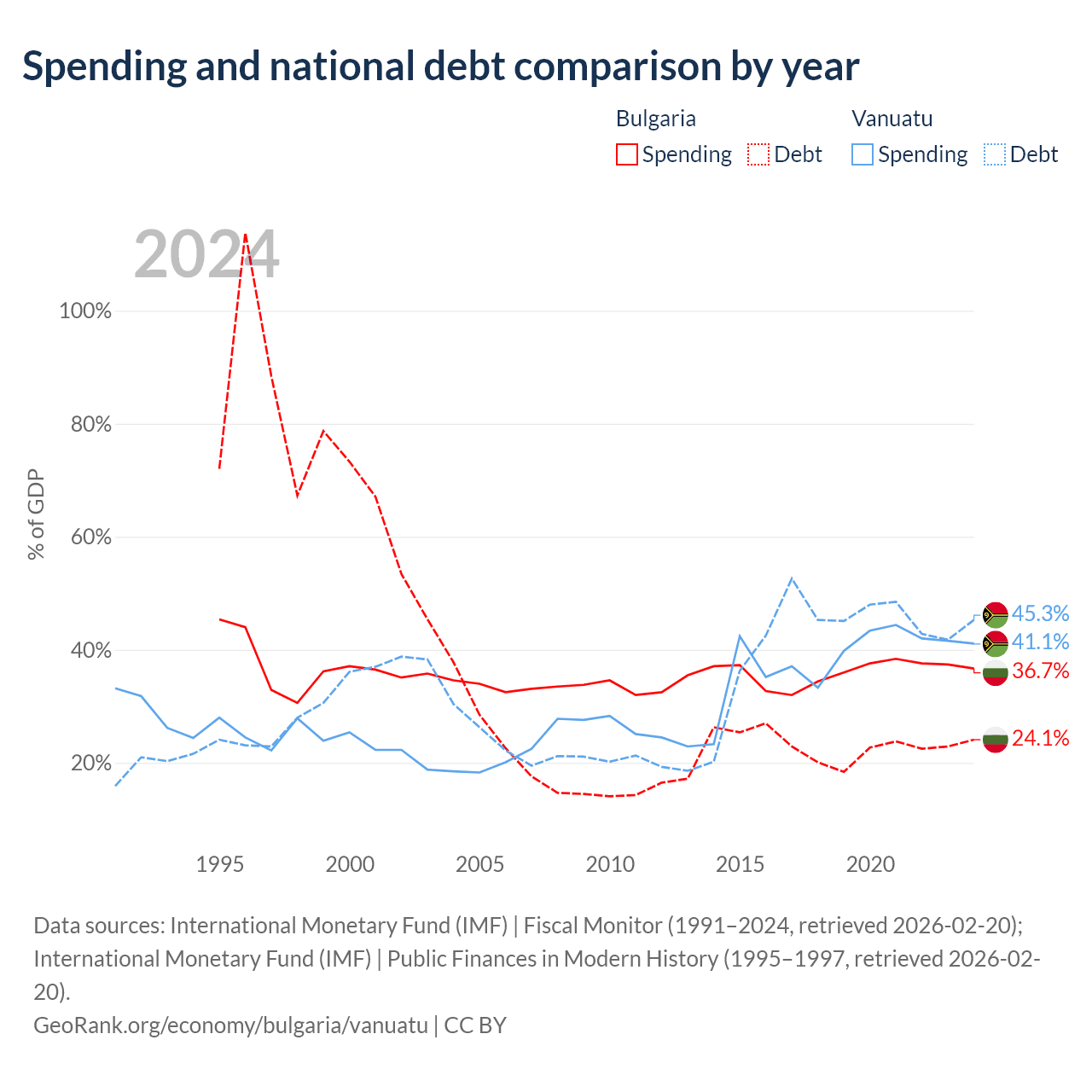 Bulgaria has $27.3B in government debt (24.1% of GDP), compared to $507M (45.3% of GDP) in Vanuatu.