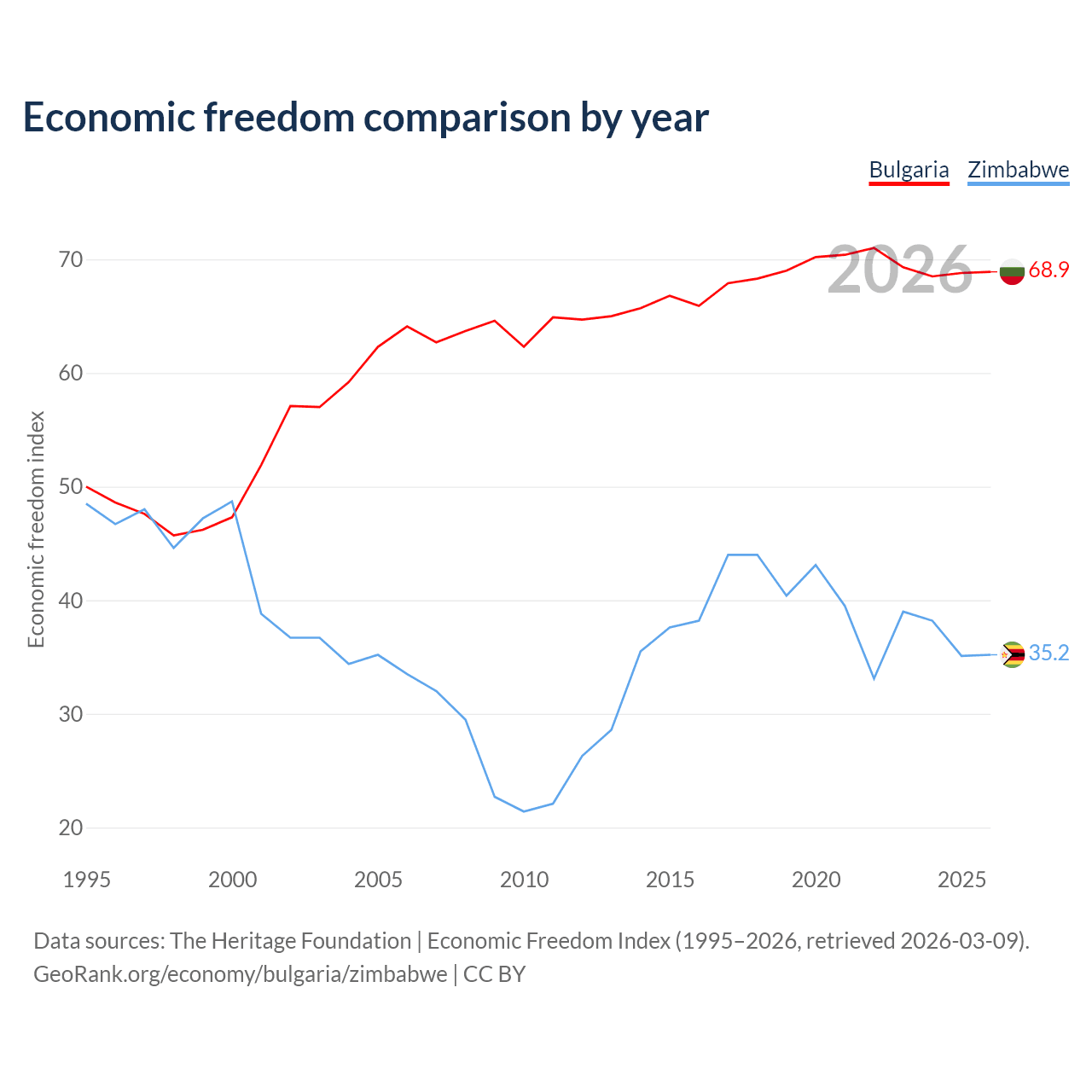 The Economic Freedom Index for Bulgaria is 68.9, ranking 44/197, compared to 35.2 for Zimbabwe, ranking 190/197. The chart above displays a comparison of annual changes in economic freedom indexes.