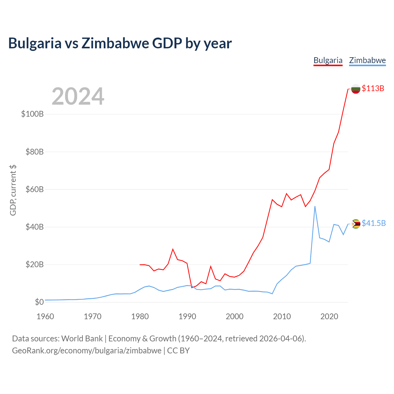 Bulgaria has a GDP of $113B compared to $41.5B for Zimbabwe, ranking 67/197 and 102/197 by economy size, respectively.