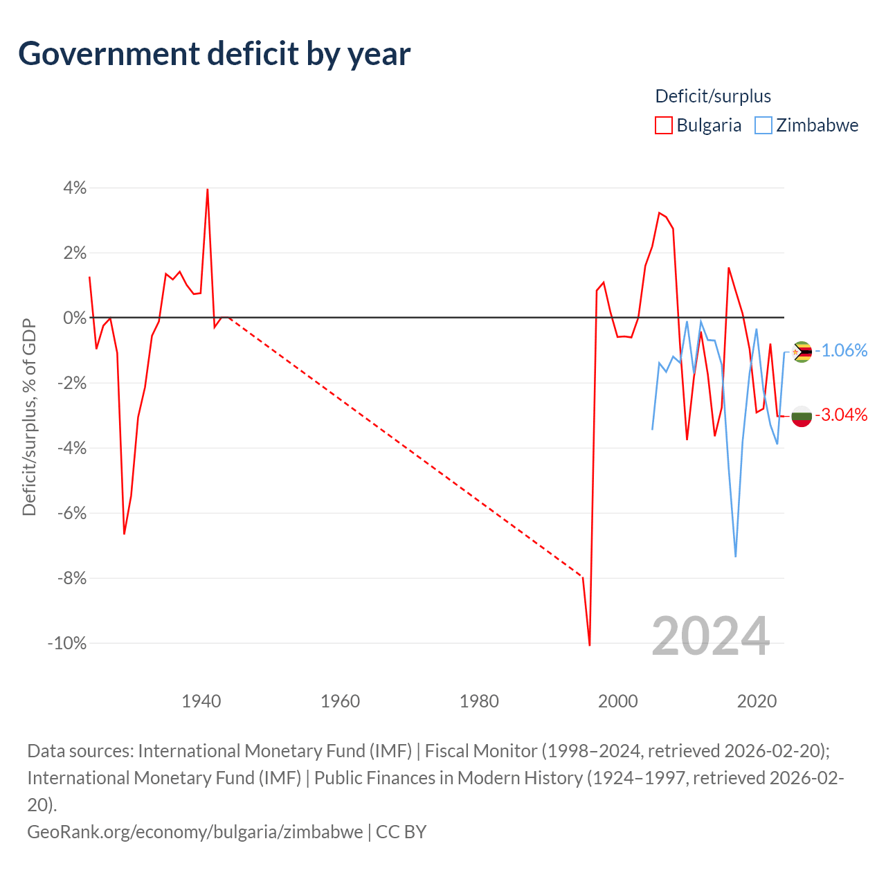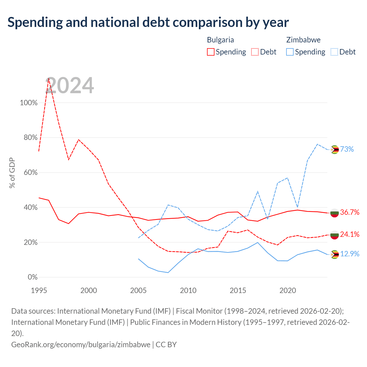 Bulgaria has $27.3B in government debt (24.1% of GDP), compared to $30.3B (73% of GDP) in Zimbabwe.
