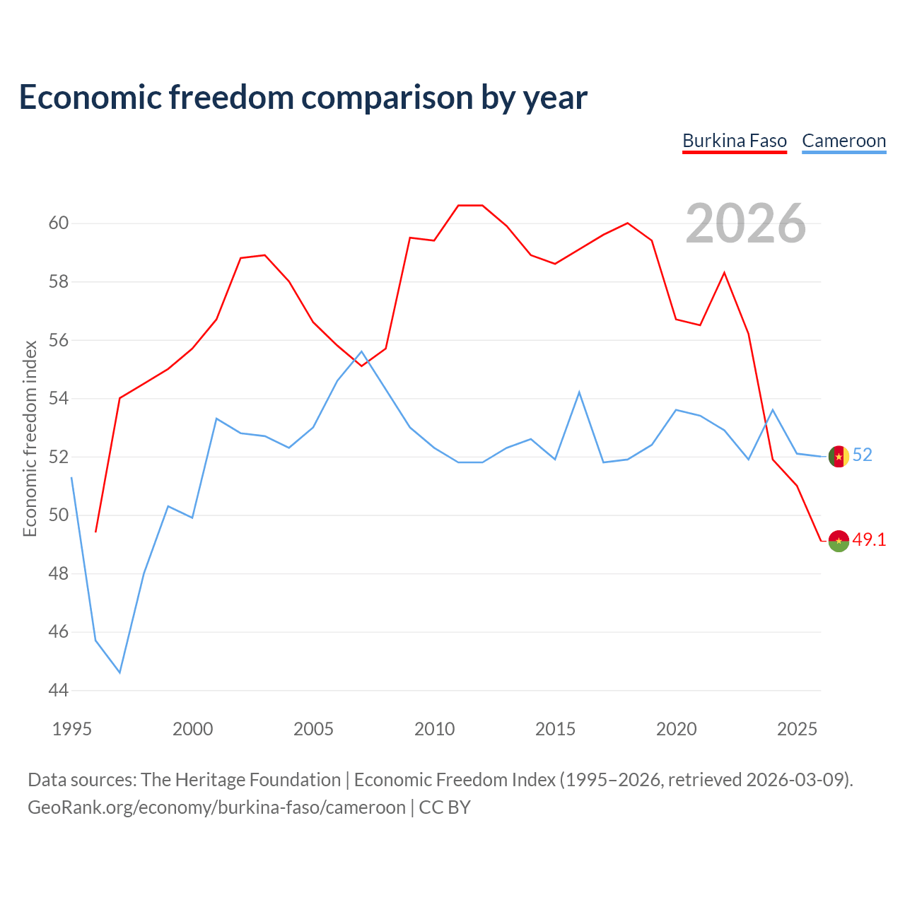 The Economic Freedom Index for Burkina Faso is 49.1, ranking 167/197, compared to 52 for Cameroon, ranking 151/197. The chart above displays a comparison of annual changes in economic freedom indexes.