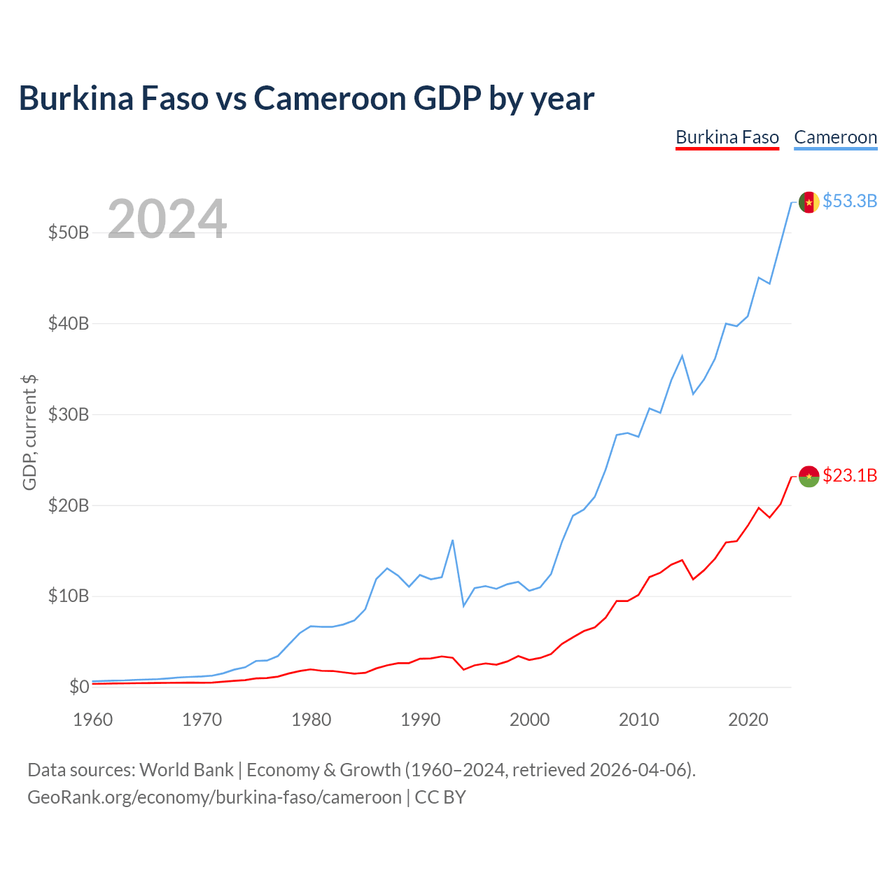 Burkina Faso has a GDP of $23.1B compared to $53.3B for Cameroon, ranking 122/197 and 91/197 by economy size, respectively.