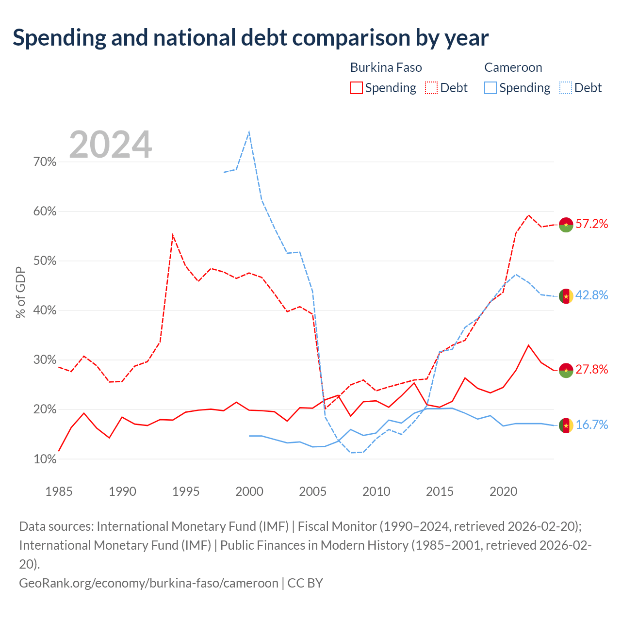 Burkina Faso has $13.2B in government debt (57.2% of GDP), compared to $22.8B (42.8% of GDP) in Cameroon.