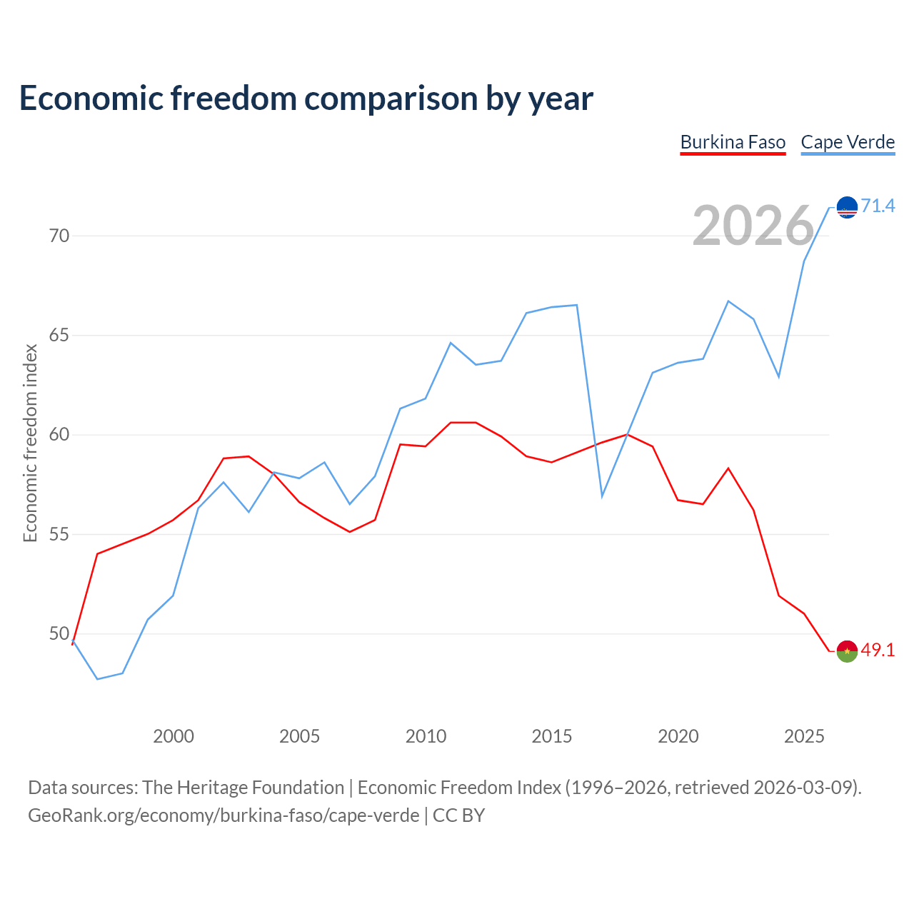 The Economic Freedom Index for Burkina Faso is 49.1, ranking 167/197, compared to 71.4 for Cape Verde, ranking 32/197. The chart above displays a comparison of annual changes in economic freedom indexes.