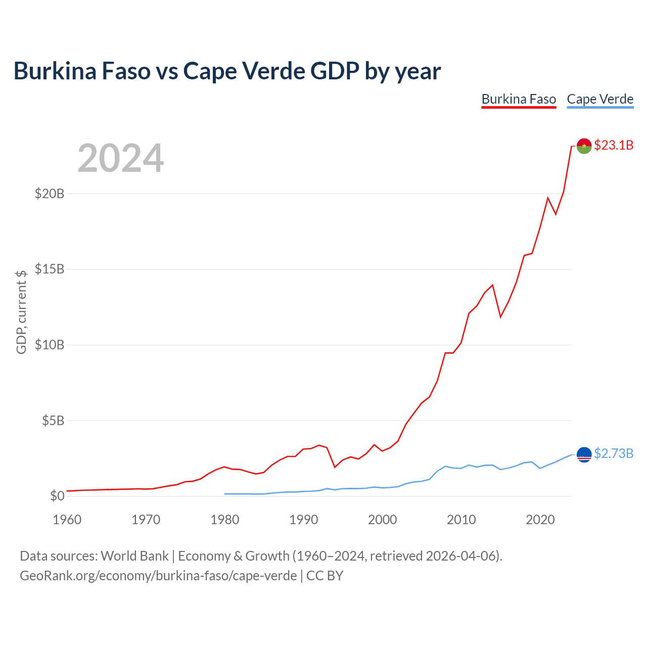 Burkina Faso has a GDP of $23.1B compared to $2.73B for Cape Verde, ranking 122/197 and 172/197 by economy size, respectively.
