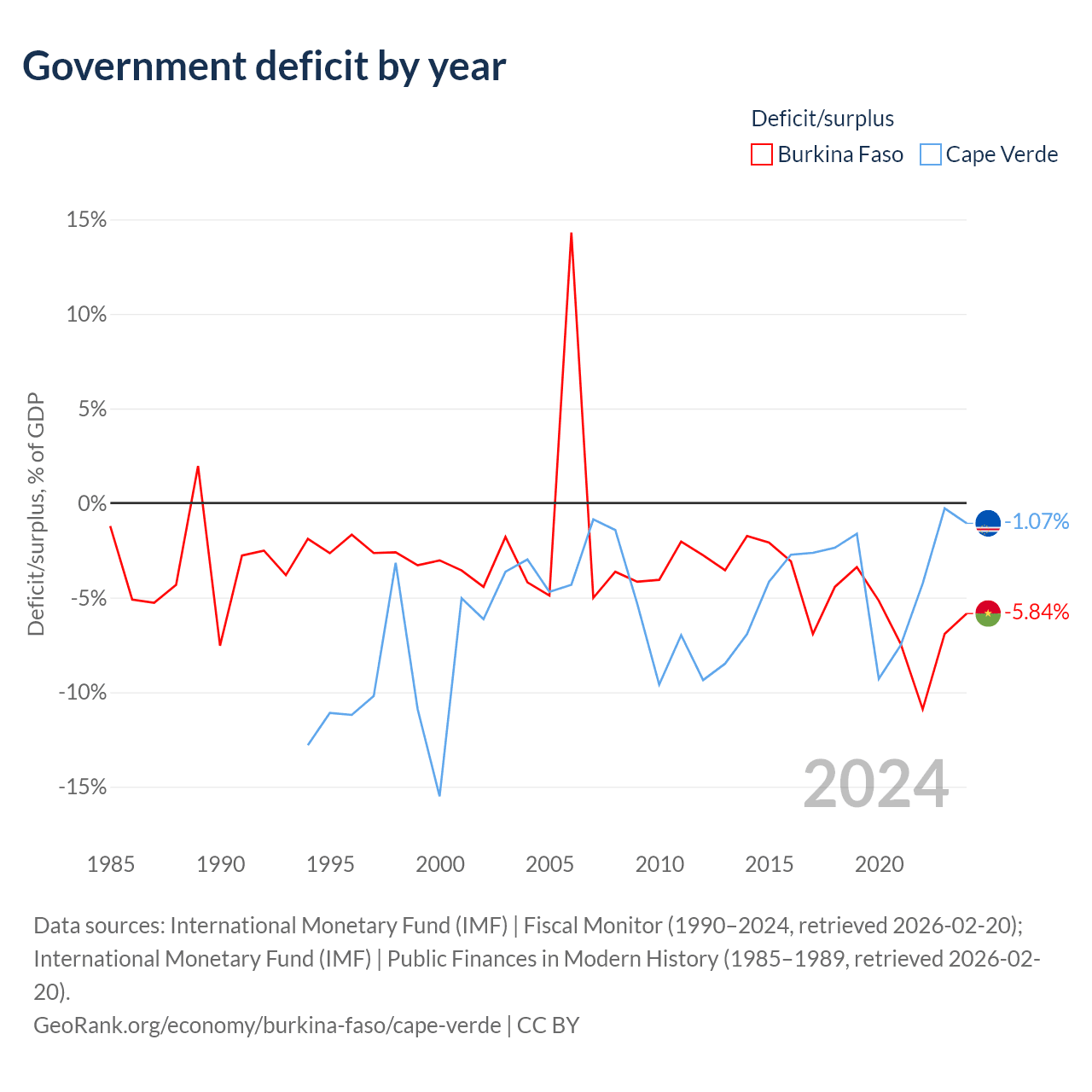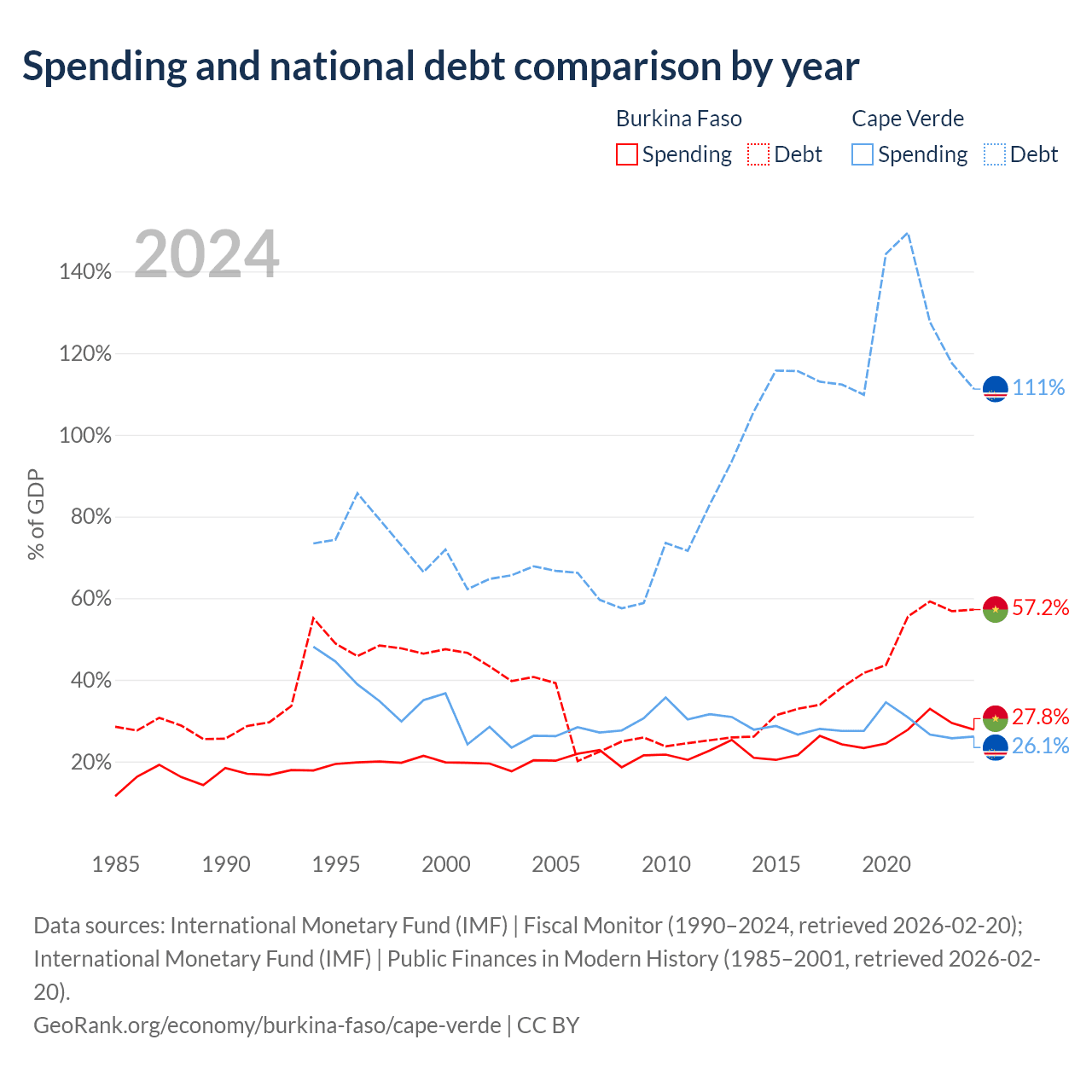 Burkina Faso has $13.2B in government debt (57.2% of GDP), compared to $3.03B (111.2% of GDP) in Cape Verde.