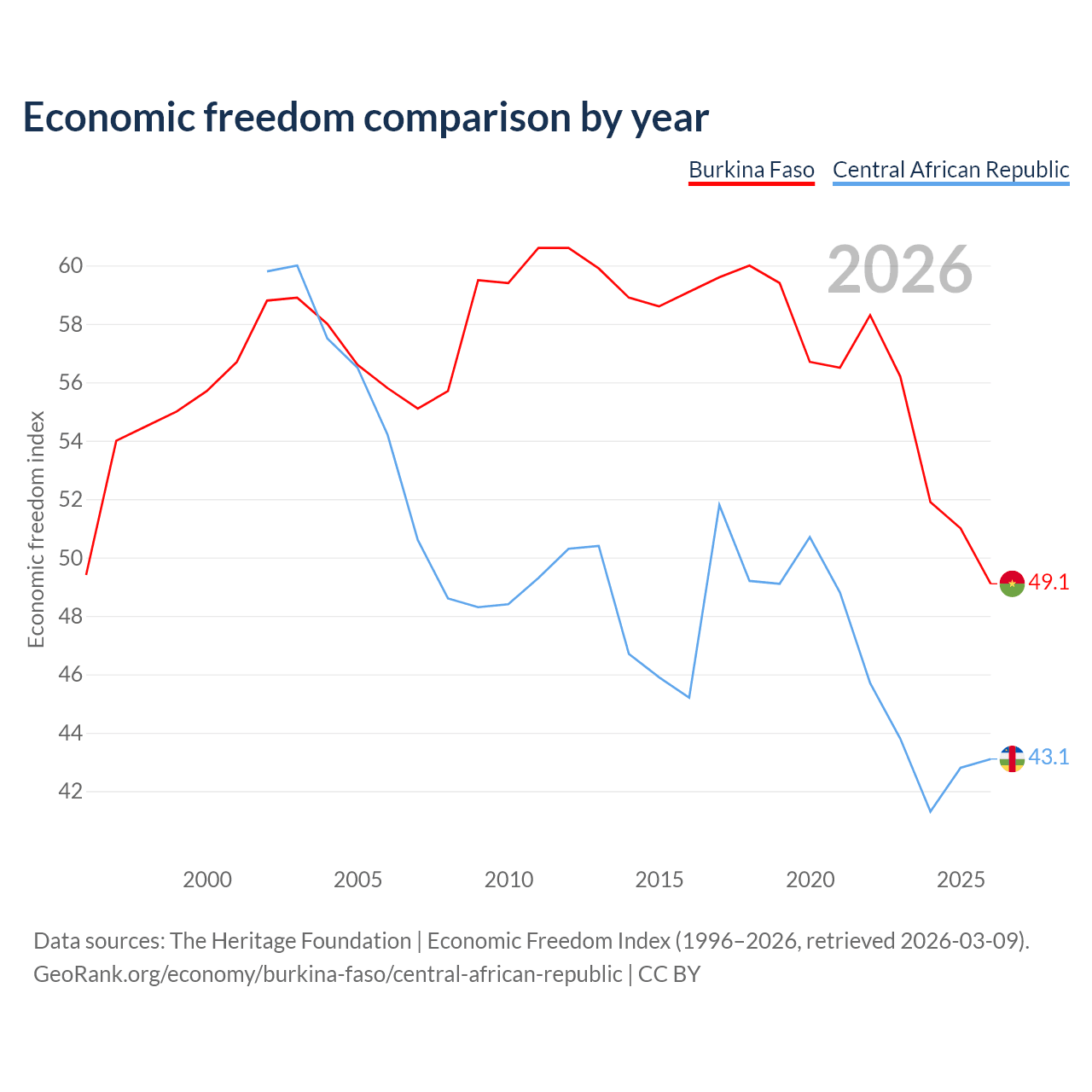 The Economic Freedom Index for Burkina Faso is 49.1, ranking 167/197, compared to 43.1 for the Central African Republic, ranking 182/197. The chart above displays a comparison of annual changes in economic freedom indexes.