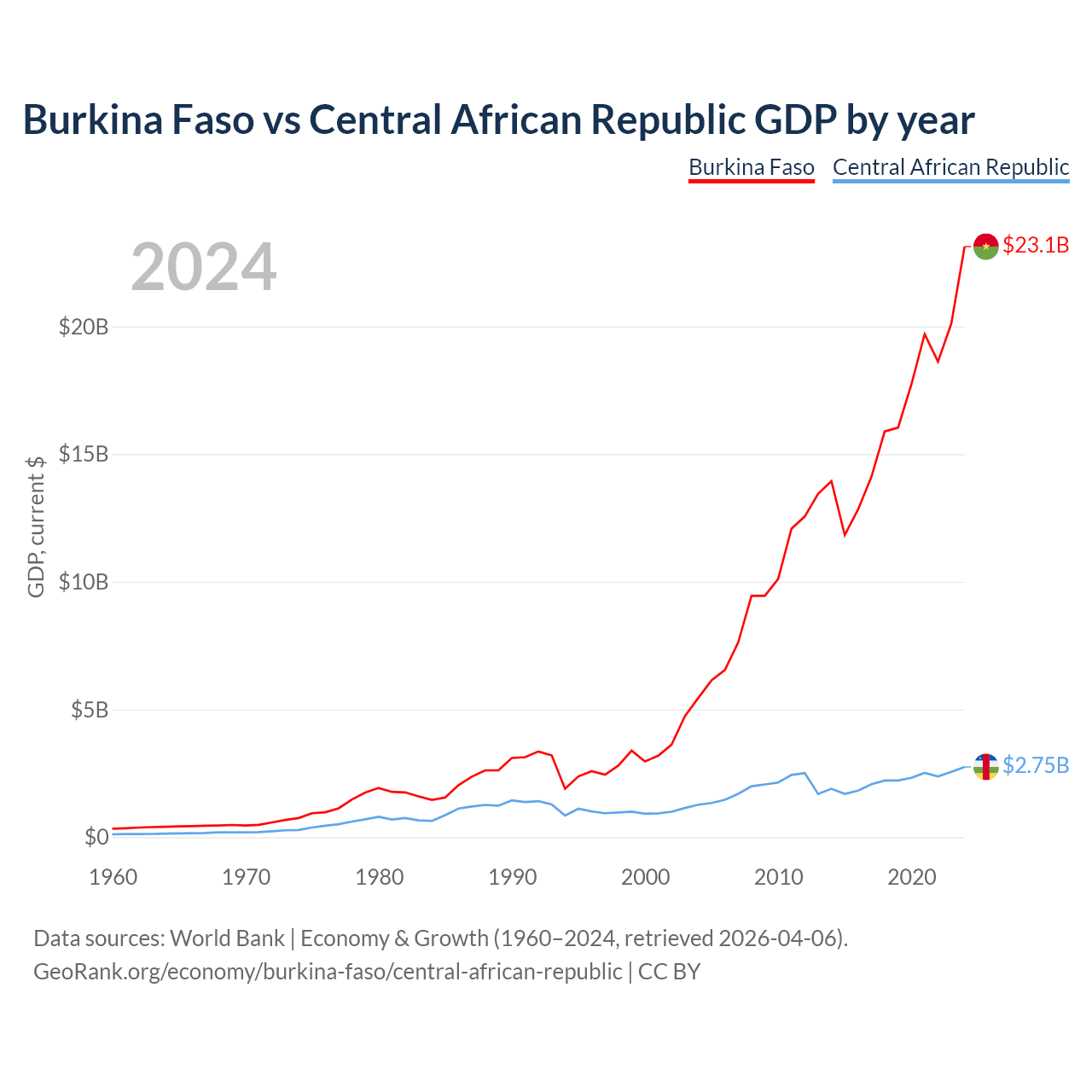 Burkina Faso has a GDP of $23.1B compared to $2.75B for the Central African Republic, ranking 122/197 and 171/197 by economy size, respectively.