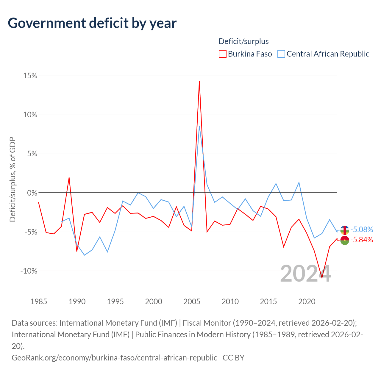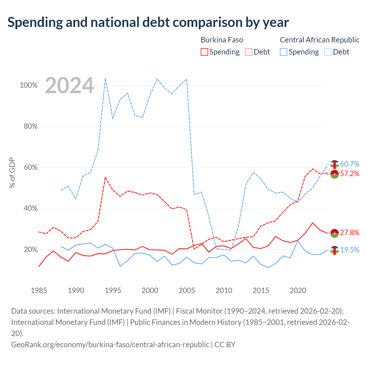 Burkina Faso has $13.2B in government debt (57.2% of GDP), compared to $1.67B (60.7% of GDP) in the Central African Republic.