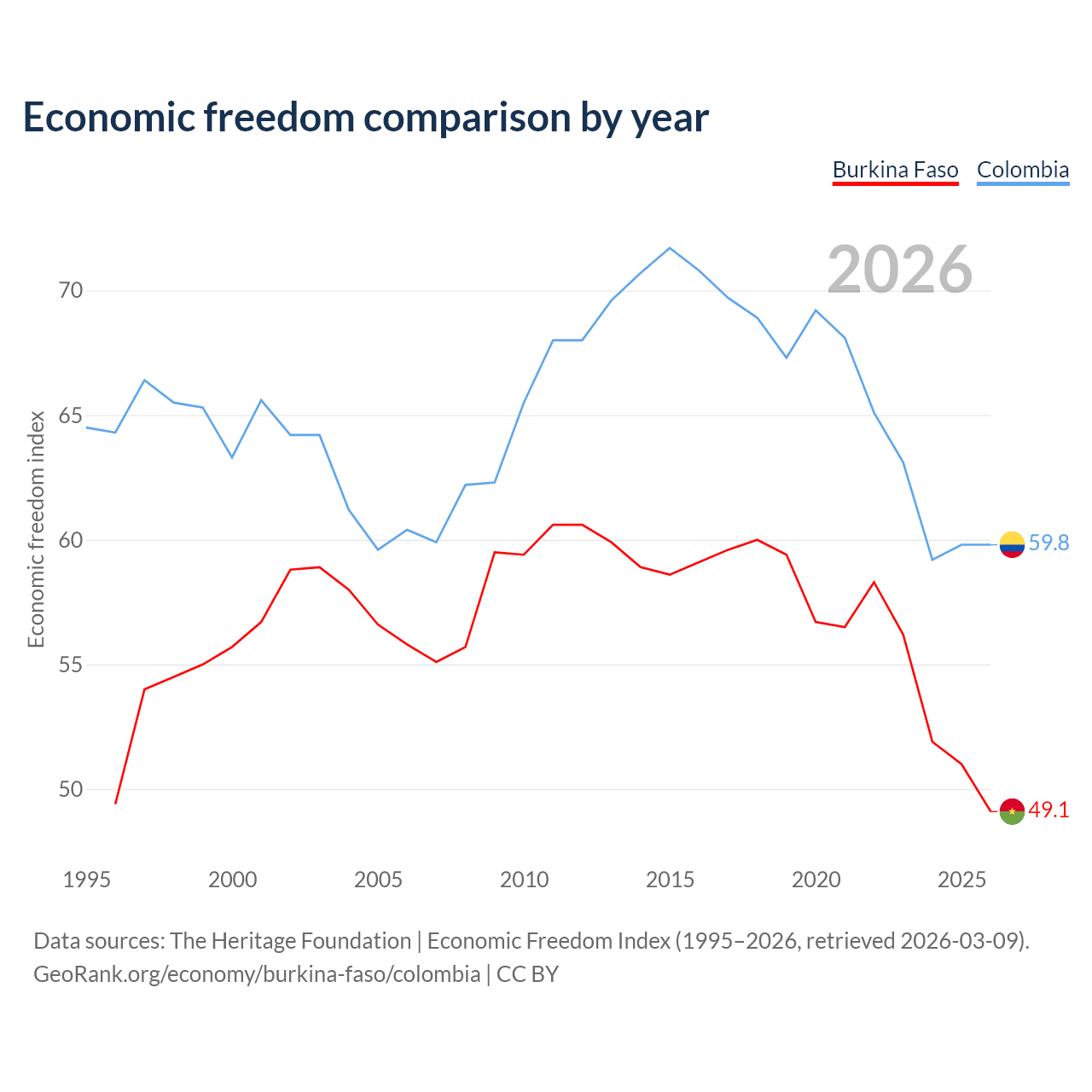 The Economic Freedom Index for Burkina Faso is 49.1, ranking 167/197, compared to 59.8 for Colombia, ranking 101/197. The chart above displays a comparison of annual changes in economic freedom indexes.