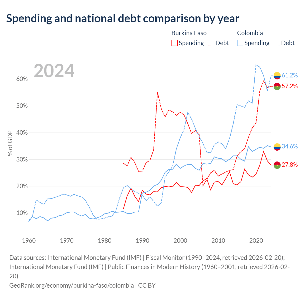 Burkina Faso has $13.2B in government debt (57.2% of GDP), compared to $256B (61.2% of GDP) in Colombia.