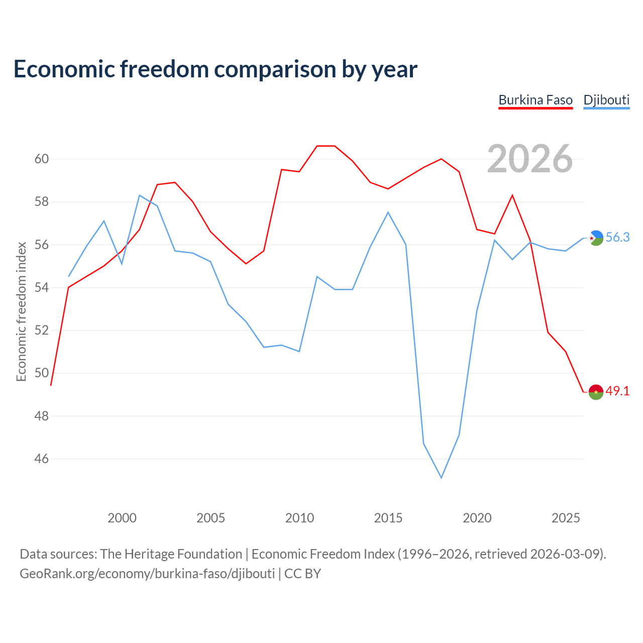 The Economic Freedom Index for Burkina Faso is 49.1, ranking 167/197, compared to 56.3 for Djibouti, ranking 122/197. The chart above displays a comparison of annual changes in economic freedom indexes.
