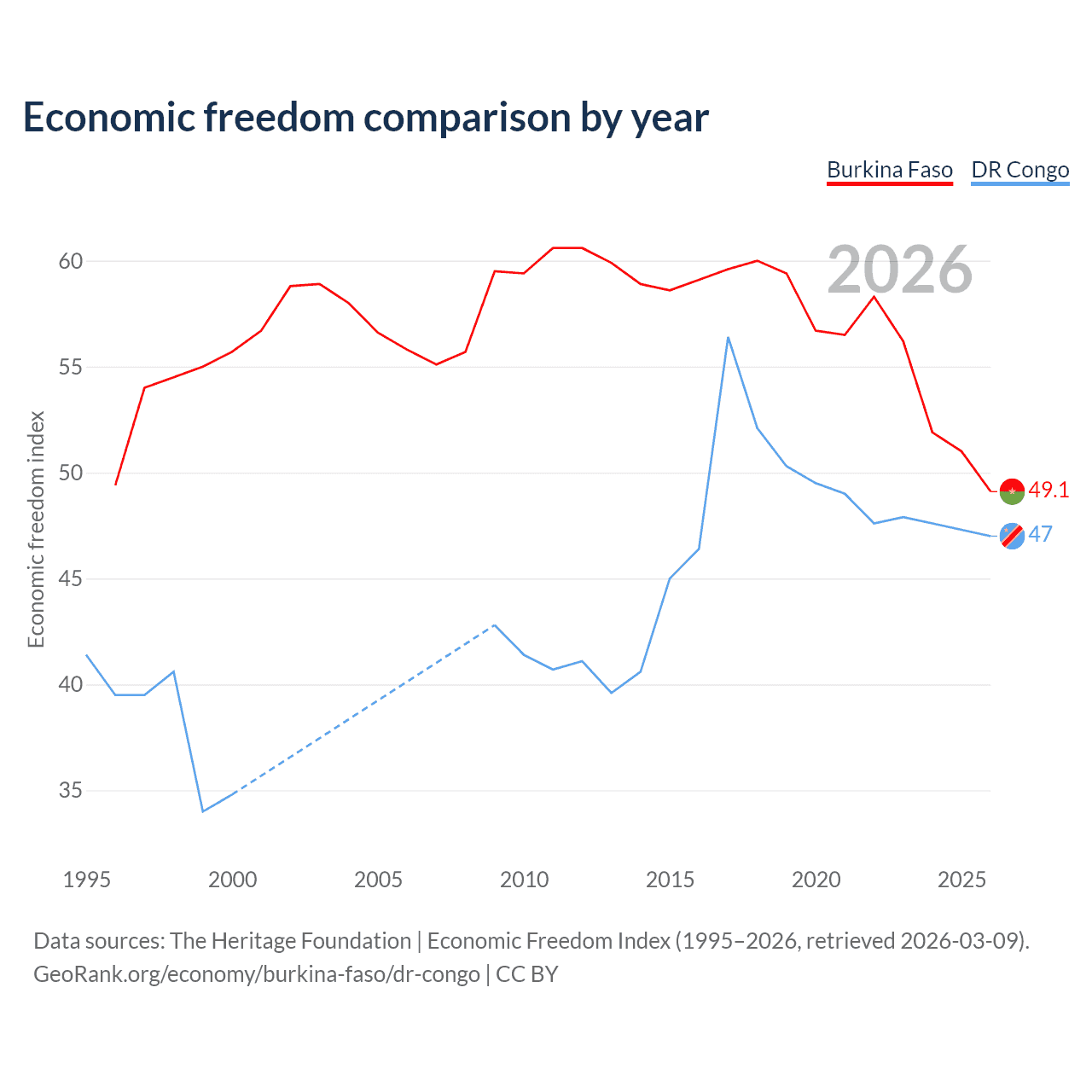 The Economic Freedom Index for Burkina Faso is 49.1, ranking 167/197, compared to 47 for the DR Congo, ranking 176/197. The chart above displays a comparison of annual changes in economic freedom indexes.