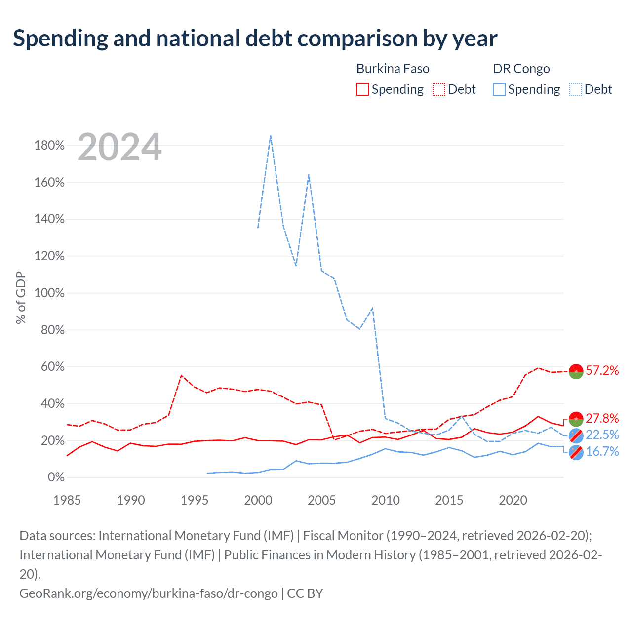 Burkina Faso has $13.2B in government debt (57.2% of GDP), compared to $16B (22.5% of GDP) in the DR Congo.